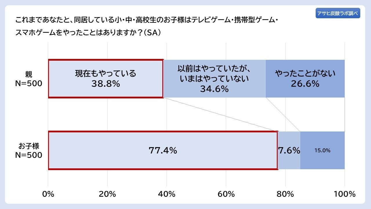 なお、実際に親世代、子ども世代のゲームの実態を調査したところ、子どもでは77.4%、大人では38.8%が現在ゲームをやっていると回答しました。
