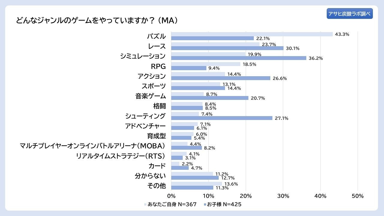やっているゲームのジャンルを聞くと、回答の多かった上位3つが、親世代では「パズル」(43.3%)、「レース」(23.7%)、「シミュレーション」(19.9%)、子ども世代では、「シミュレーション」(36.2%)、「レース」(30.1%)、「シューティング」(27.1%)と、親世代と子ども世代で「シミュレーション」「レース」という共通した2ジャンルがランクインするという結果になりました。一方で、親世代に人気の「パズル」や子ども世代に人気の「シューティング」など、親子で大きく差が出る項目も見られました。