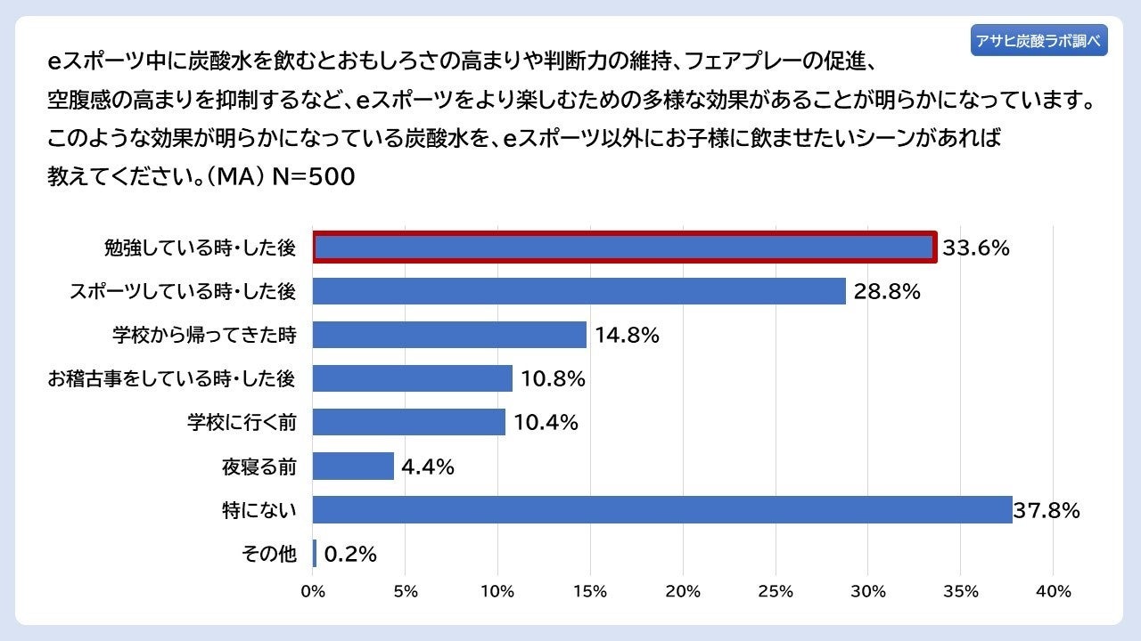 また、eスポーツのおもしろさの高まり、判断力の維持、フェアプレーの促進、空腹感の高まり抑制など、炭酸水がもたらす4つの効果をeスポーツ時以外のタイミングで子どもに飲ませたいシーンを聞いてみると、「勉強している時・した時」(33.6%)がトップになりました。