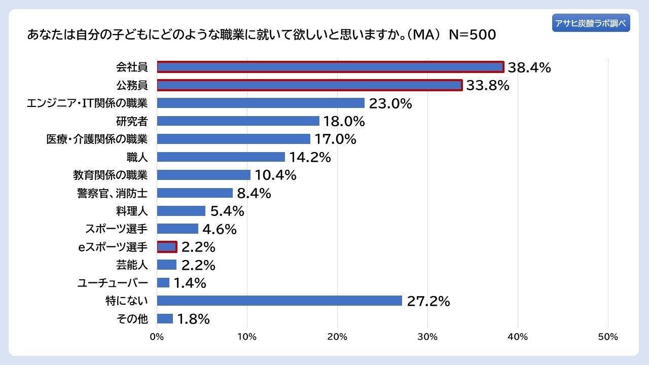 また、「自分の子どもにどのような職業に就いてほしいと思うか」と尋ねると、「会社員」(38.4%)、「公務員」(33.8%)が上位に入り、「eスポーツ選手」は2.2%に留まりました。