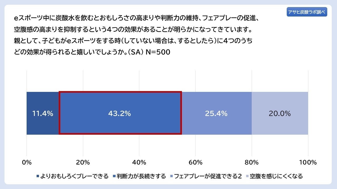 アサヒ炭酸ラボの研究で、eスポーツ中に炭酸水を飲むと、eスポーツのおもしろさの高まり、判断力の維持、フェアプレーの促進、空腹感の高まり抑制といった効果があることがわかりましたが、その4つの効果の中で親が、子どもがeスポーツをする際にもっとも効果を期待するのは「判断力が長続きする」(43.2%)ということがわかりました。