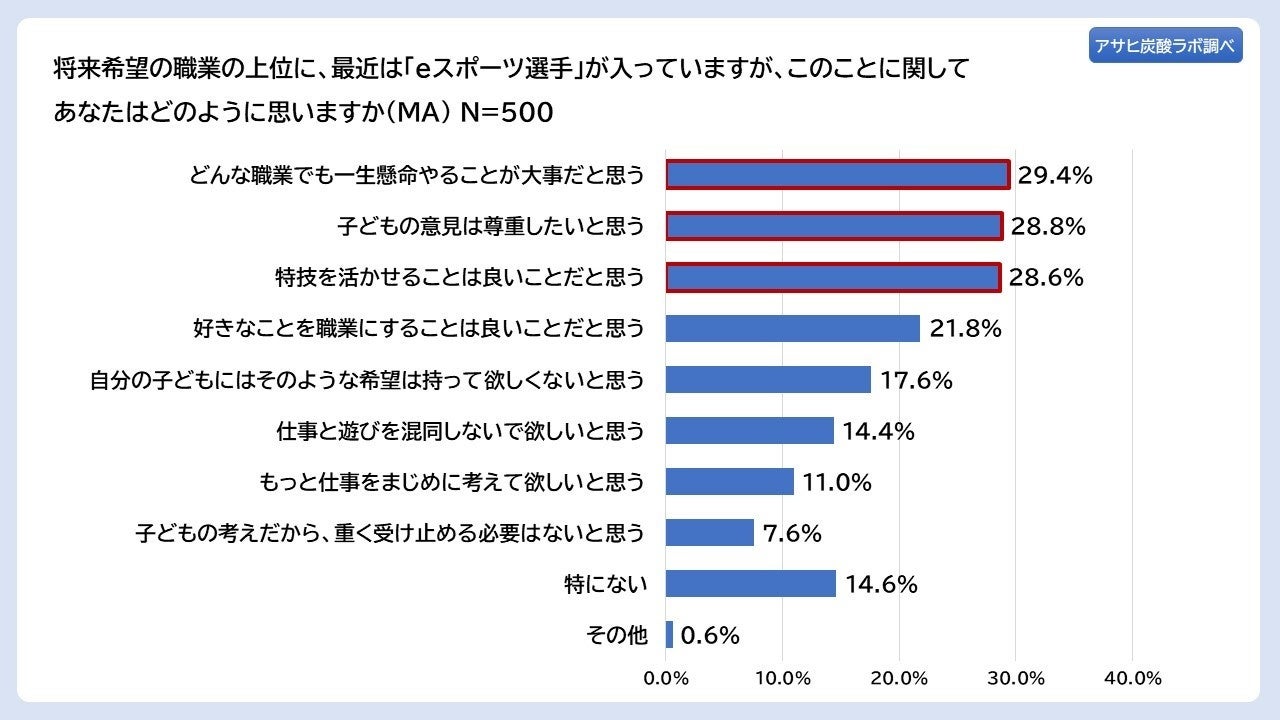 なお、eスポーツ選手が子どもの希望の職業ランキングに入ることについてどう考えているか聞いてみると、「どんな職業でも一生懸命やることが大事だと思う」(29.4%)、「子どもの意見は尊重したいと思う」(28.8%)、「特技を活かせることが良いことだと思う」(28.6%)と、eスポーツ選手になることに反対している中でも、子どもの選んだことや特技を活かすことは応援したいという親の意向が見えました。