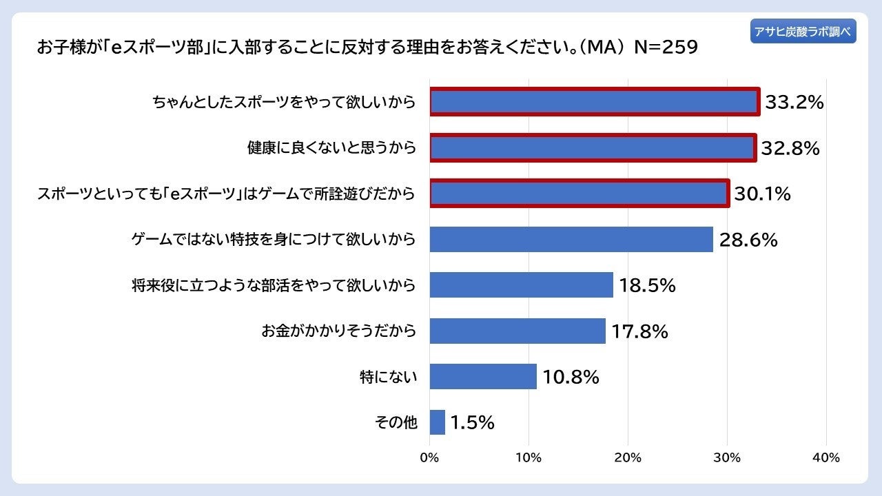 最近、学校の新しい部活として立ち上がっているeスポーツ部への入部についても約半数となる51.8%の親が「反対」と回答し、その理由として「ちゃんとしたスポーツをやってほしいから」(33.2%)、「健康に良くないと思うから」(32.8%)などがあがり、eスポーツのスポーツとしての理解されづらさや健康によくないというイメージが反対の理由であることがわかりました。