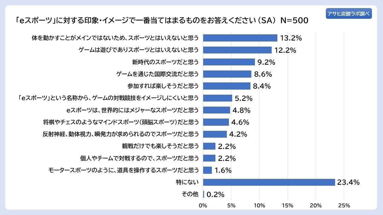 一方、「eスポーツに対する印象・イメージ」を聞くと、「体を動かすことがメインでないため、スポーツとはいえないと思う」(13.2%)、「ゲームは遊びでありスポーツとはいえないと思う」(12.2%)など、スポーツとはいえないという声がある中、「新時代のスポーツだと思う」(9.2%)、「ゲームを通じた国際交流だと思う」(8.6%)、「参加すれば楽しそうだと思う」(8.4%)など、eスポーツについての将来に可能性を感じているというような意見も聞かれました。