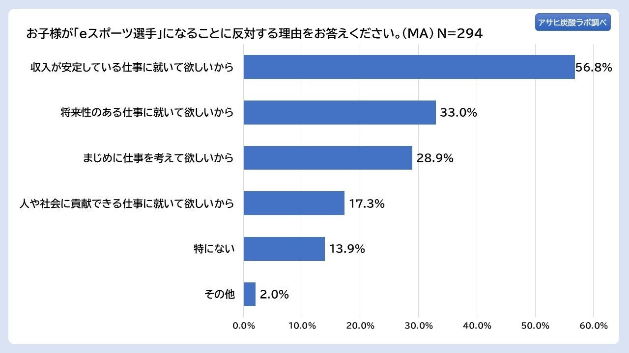 反対の理由を親に尋ねると、「収入が安定している仕事に就いて欲しいから」(56.8%)、「将来性のある仕事に就いてほしいから」(33.0%)が上位に入り、「まじめに仕事を考えて欲しいから」(28.9%)と、eスポーツ選手を仕事として認知することが難しい様子が浮かびます。