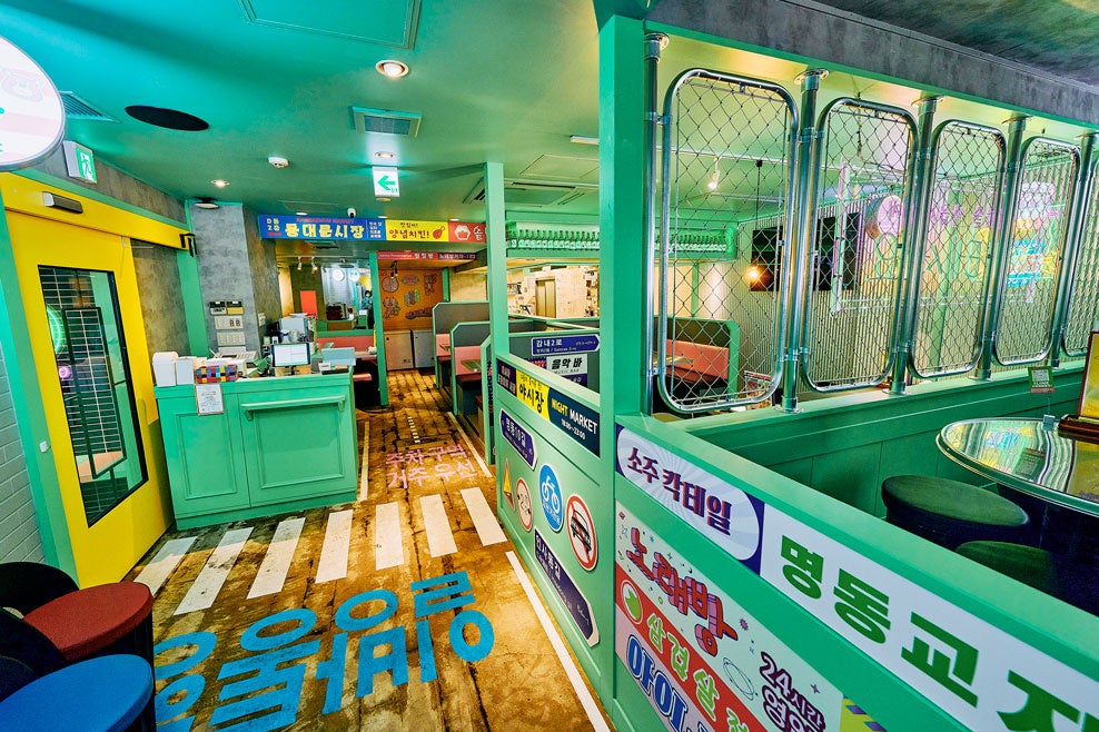 店内は流行の発信地ソウルの韓国屋台を参考に、ネオンやハングル看板が映えるSNSとの相性もいいネオ居酒屋の雰囲気と韓国的なインテリアがミックスされた空間。