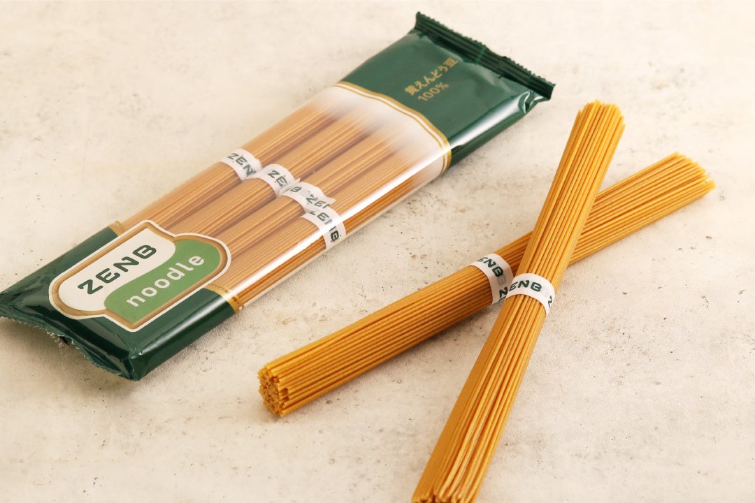 ほのかな旨みともちっとした食感が魅力の黄えんどう豆100%麺。食物繊維や植物性たんぱく質が豊富な黄えんどう豆をうす皮までまるごと使っており、いつものパスタやうどん、中華麺、ごはんと比べて糖質は30%オフ。