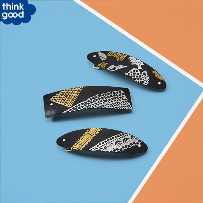 地金に金や銀を打ち込むことで、美しい柄を表現する京象嵌。<中嶋象嵌>は、若い世代にもその魅力を発信するため、常に新しいデザインにチャレンジしています。今回ご紹介するのは、これまではまとめて処理加工されていた「型抜き後の素材」を使ったバレッタ。偶然に生まれた幾何学的な模様が、新たな魅力となっています。