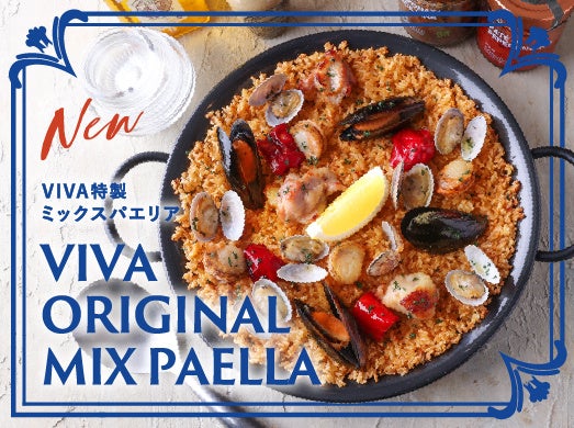 『VIVA特製ミックスパエリア』は、ムール貝、ほたて、アサリなどの魚介と、柔らかいローストチキン、さらにパブリカをのせ、チキンスープとシーフードスープをフレンドした旨みたっぷりのダブルスープで焼き上げたパエリアです。