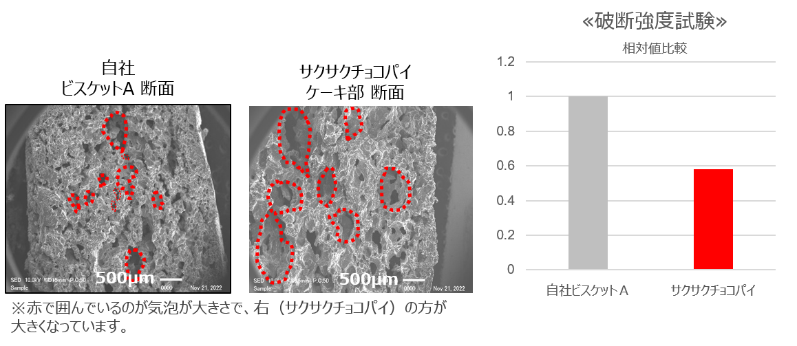 また、ビスケットの強度を測定する破断強度試験のデータによると自社ビスケット商品Aと比較してもろいことが分かります。