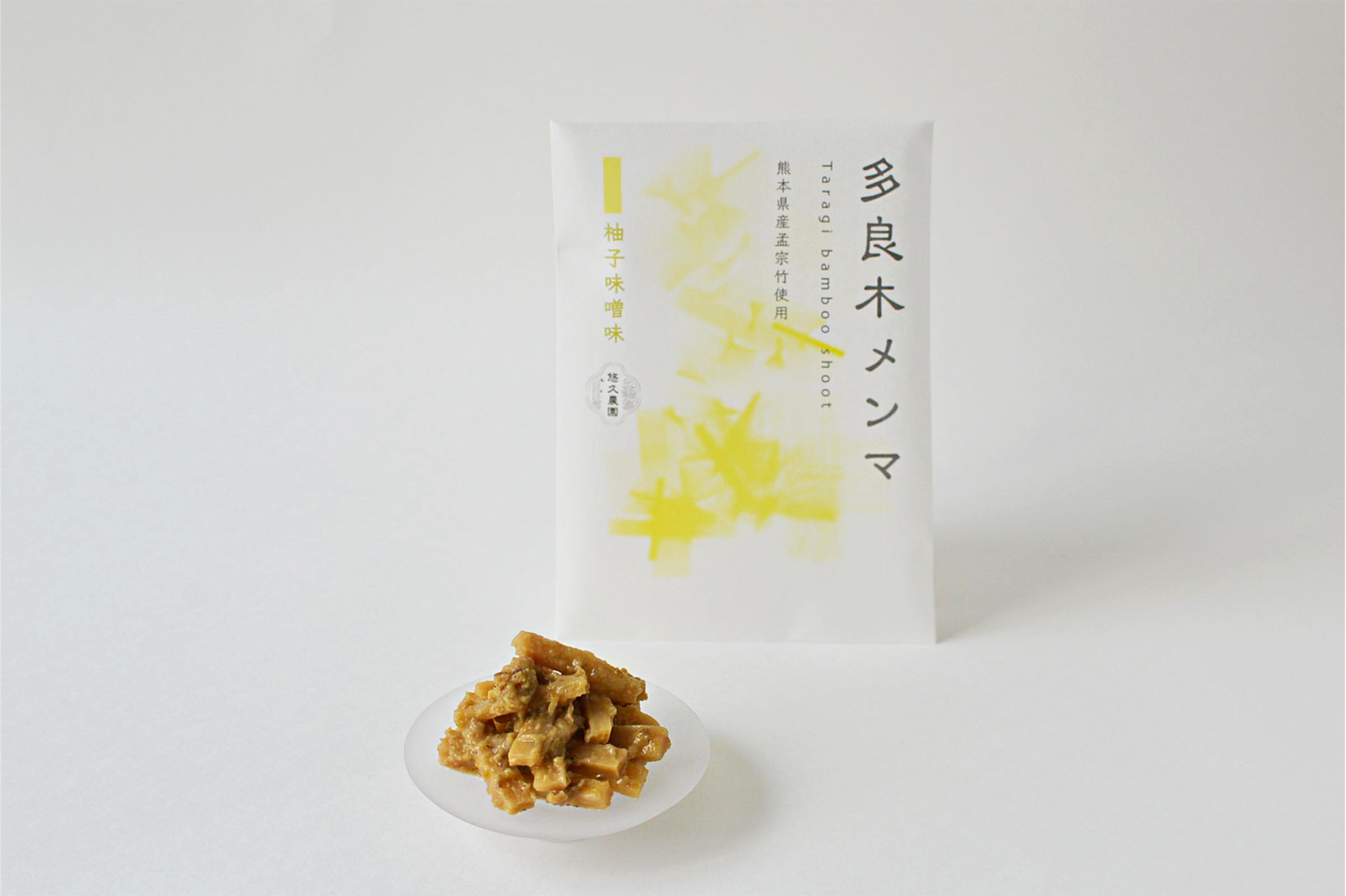 人吉球磨地域の家庭では欠かせない「柚子味噌」で味付けしたメンマです。栽培が難しいとされる黄色の唐辛子と完熟させた柚子を使用した希少な柚子胡椒と、多良木産の味噌を使っています。柚子の香りと味噌のコクがマッチして、旨味と甘味がさわやかに広がります。