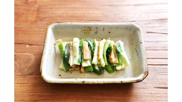 ねぎを5cmほどに切りさっと茹でたら、「多良木メンマ 柚子味噌味」とお酢を混ぜ合わせ、最後に和えます。ねぎはもちろん、メンマの食感も加わって、噛めば噛むほど柚子味噌の香りと甘みが広がります。