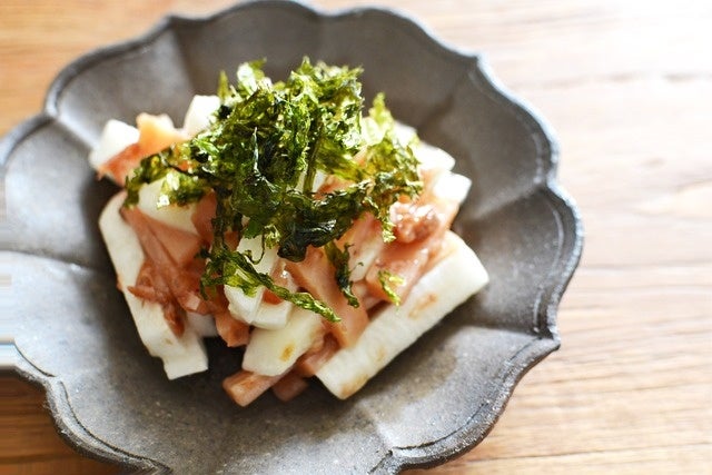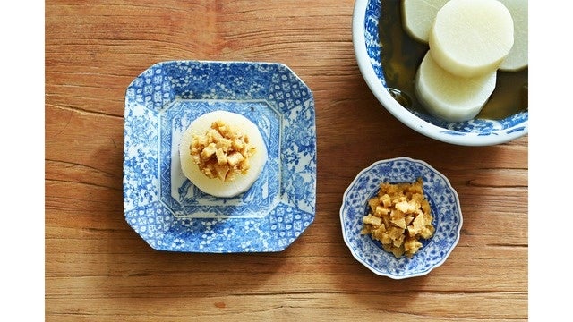 出汁の効いたアツアツの大根が冷めないうちに、粗めに刻んだ「多良木メンマ 柚子味噌味」をのせるだけ。甘みと酸味のある柚子味噌が、ふろふき大根の味をひきたて、メンマとの相性も抜群。新しい和食の定番メニューにどうぞ。