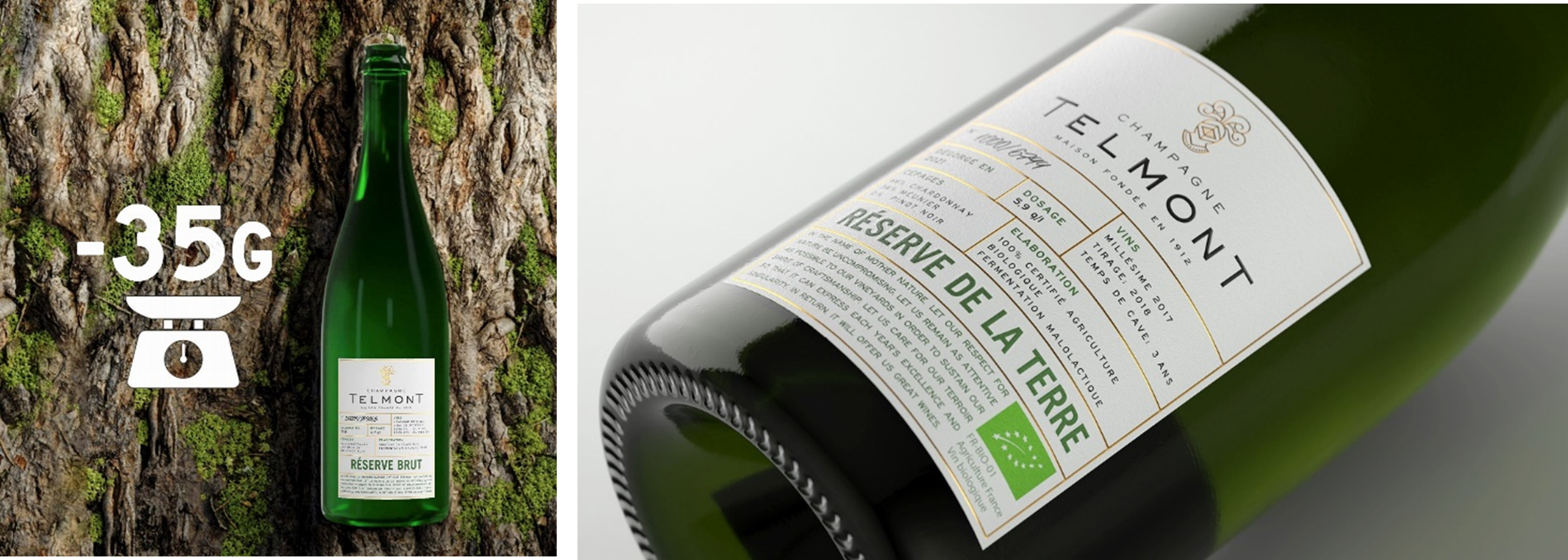 従来のシャンパーニュメゾンの慣行と決別し、2021年から「すべてはボトルにあり、ボトル以外に何も必要なし」という方針に基づいて、外装材やギフト包装材の製造と使用を禁止しました。これはシャンパーニュ地方で初めての取り組みです。また、現状メゾン製品の15%を占めている透明ボトルの使用を2021年に廃止し、ガラスの85%がリサイクルで製造され、使用後は100%リサイクル可能なグリーンボトルに切り替えていきます。さらにテルモンは、他のワインやシードルに使ったボトルの再利用にも乗り出します。