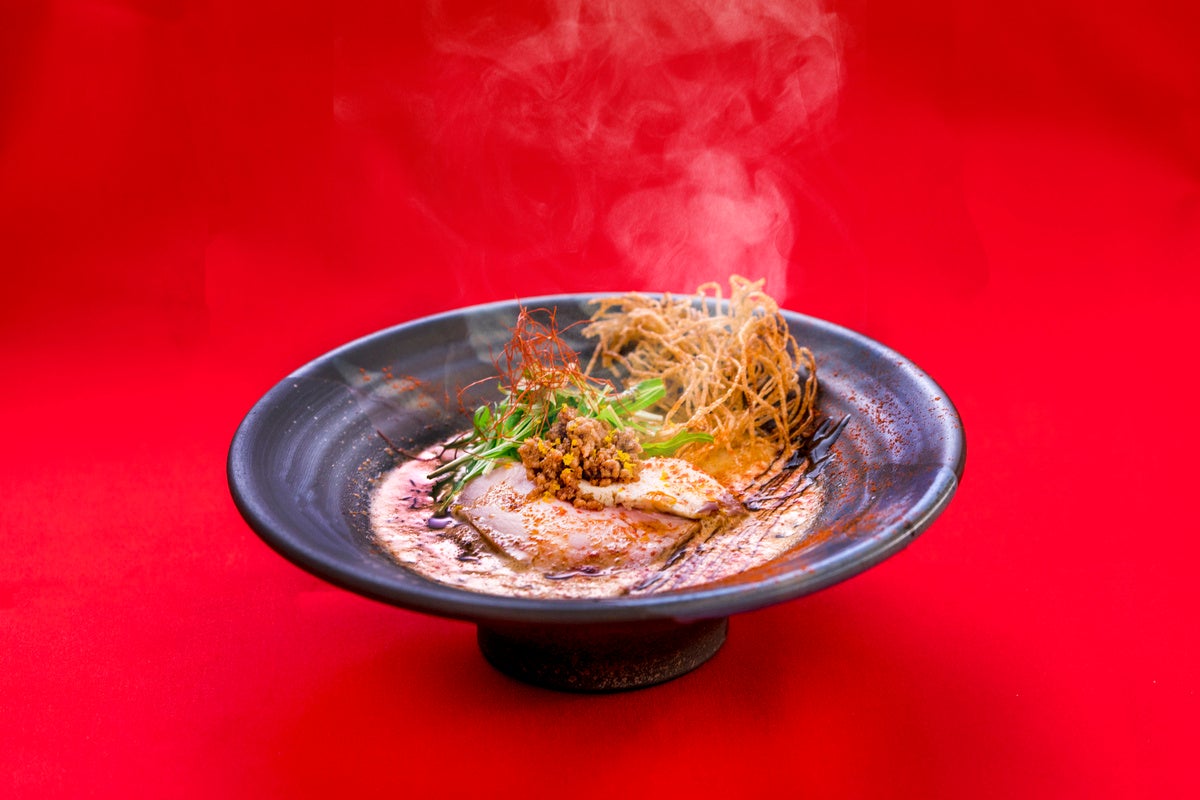 地元の水産会社直送の「真鯛」をふんだんに使用したスープと、泡立てた香り高いごまだれのまろやかなマリアージュを楽しめる、新感覚の鯛担麺をぜひこの機会にお召し上がりください。