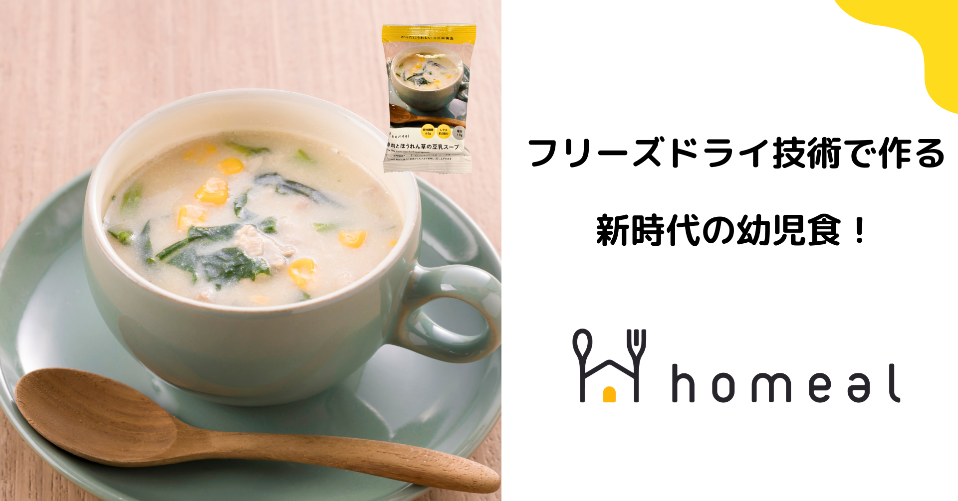 “幼児食の悩みをゼロに。“を目指す冷凍幼児食ブランド「homeal(ホーミール)」を運営するhomeal株式会社は、2023年4月6日(木)より、お湯を注ぐだけで手軽に栄養が摂れるフリーズドライタイプのミニ栄養スープ「豚肉とほうれん草の豆乳スープ」を発売いたしました。