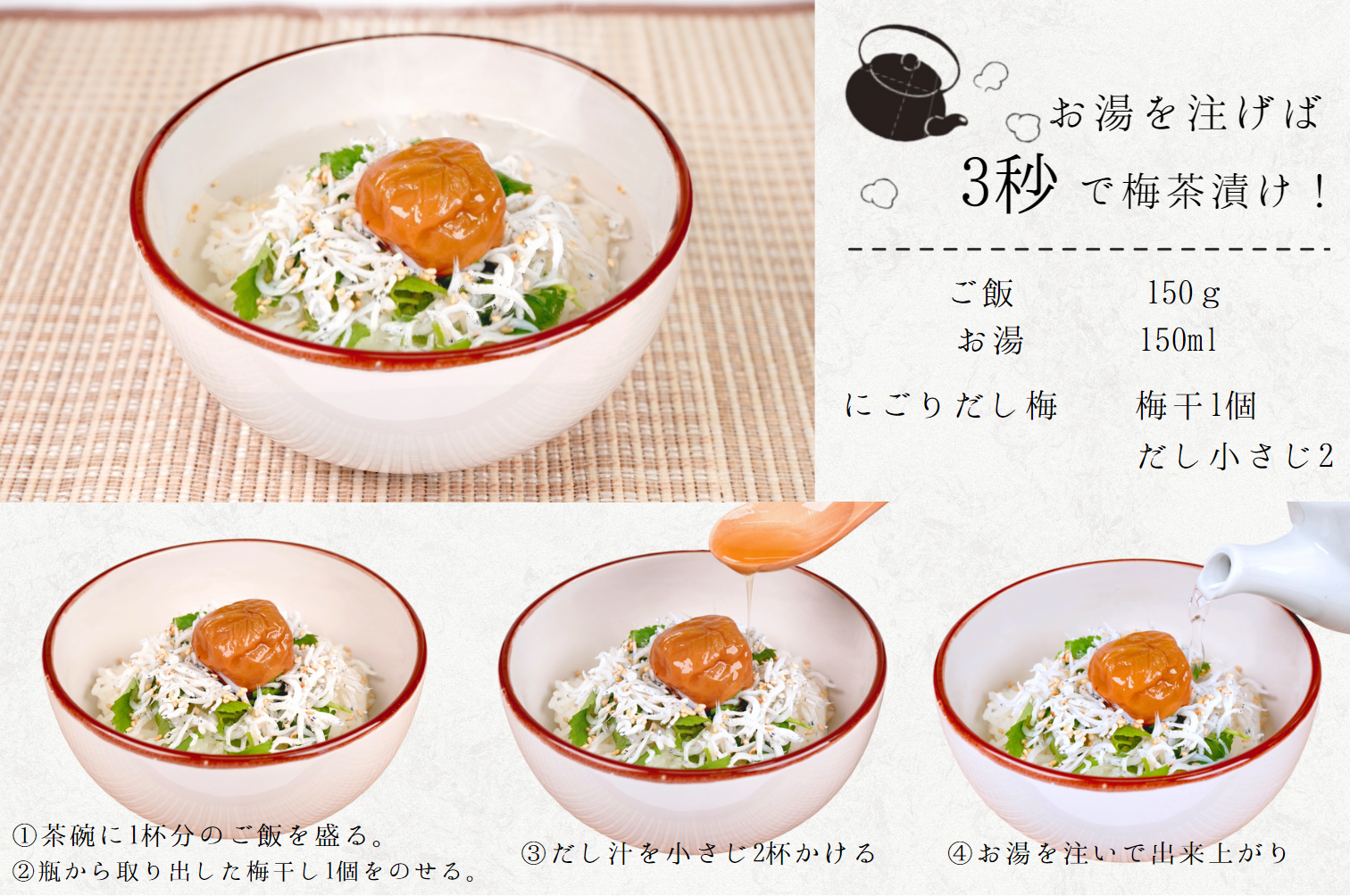 当商品は「お茶漬け専用」と謳っているものの、梅干しのみならずだしも使えば様々な料理に使用することが出来ます。例えば、腸活としてSNS等でも話題の食事療法「梅流し」も大根のみご準備いただければ当商品で手軽に作ることが出来ます。(※梅流しは頻繁に行うと、腸内の老廃物や悪玉菌だけでなく、善玉菌まで洗い流してしまいますのでご注意ください。)他にも、白米やお味噌を加えておじやにしてみたり、旬のお野菜とお水と一緒に梅干しやだしも煮込んで頂いても美味しくお召し上がり頂けます。杏耶さん考案レシピも商品ページにて公開中。