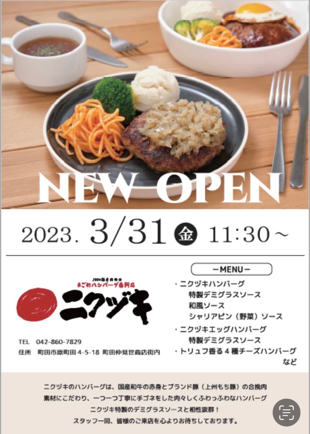 2023年3月31日、レトロ感漂う町田仲見世商店街の中に、わずか2.5坪カウンターのみのお店ながら本格手ごねハンバーグが楽しめる「手ごねハンバーグ専門店 ニクヅキ」が個人独立開業向けFCを視野に入れたプロジェクトとして、1号店をオープンいたしました。