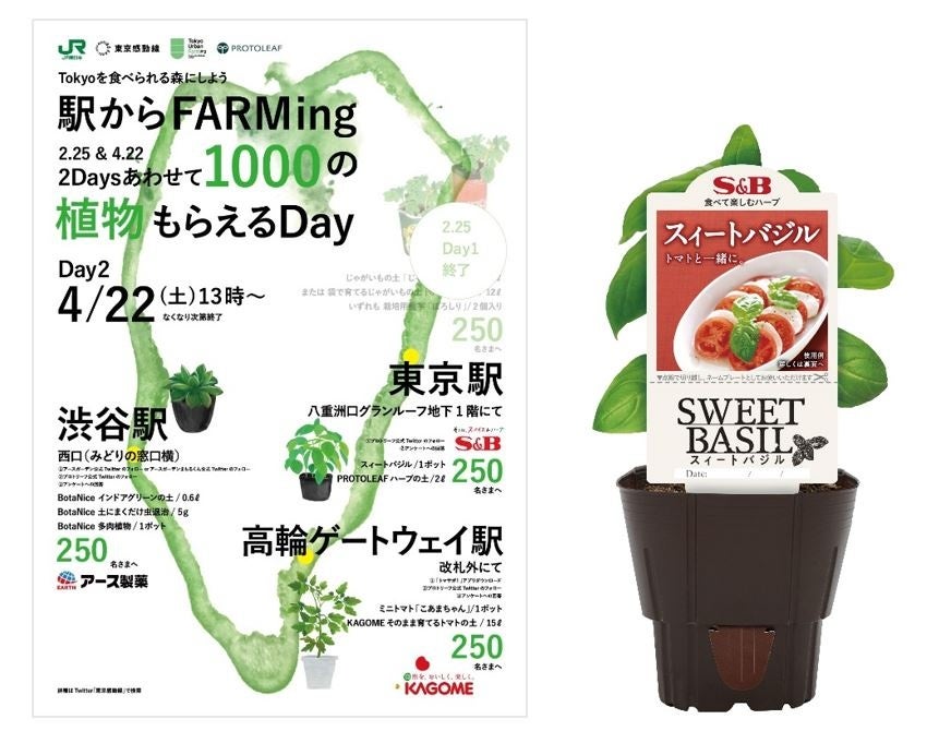 エスビー食品株式会社は、東日本旅客鉄道株式会社による「東京感動線」の取組みの一環である「駅からFARMing」に昨年に引き続き賛同し、4月22日(土)13時より東京駅八重洲口グランルーフ地下1階にて、S&Bハーブ苗を無料配布します。