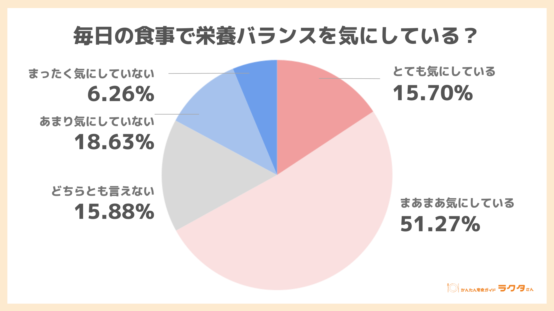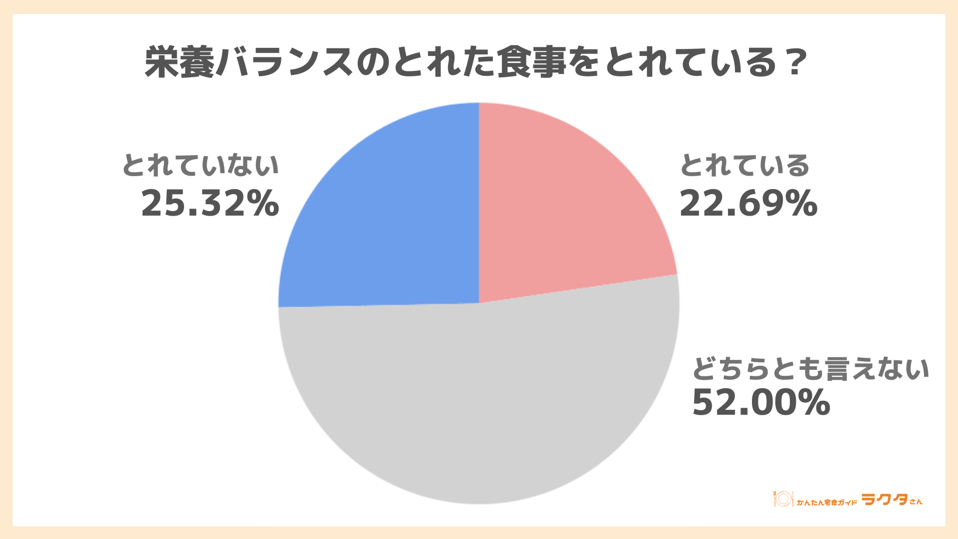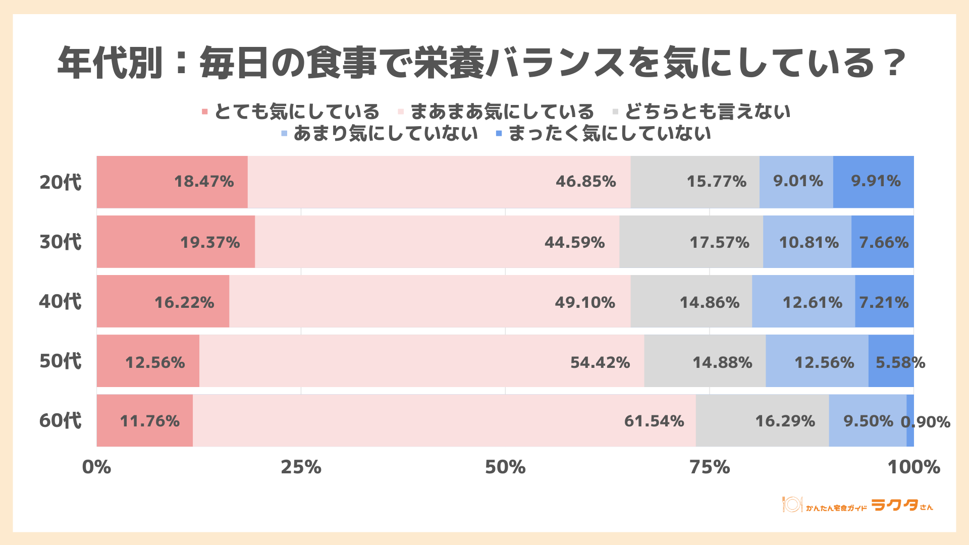 ナイル株式会社(本社:東京都品川区、 代表取締役社長:高橋飛翔、 以下ナイル)が運営する「かんたん宅食ガイド ラクタさん」にて、20代~60代男女1,102人を対象に、2023年3月28日~4月4日の期間で、食事の栄養バランスに関するアンケートを実施しました。