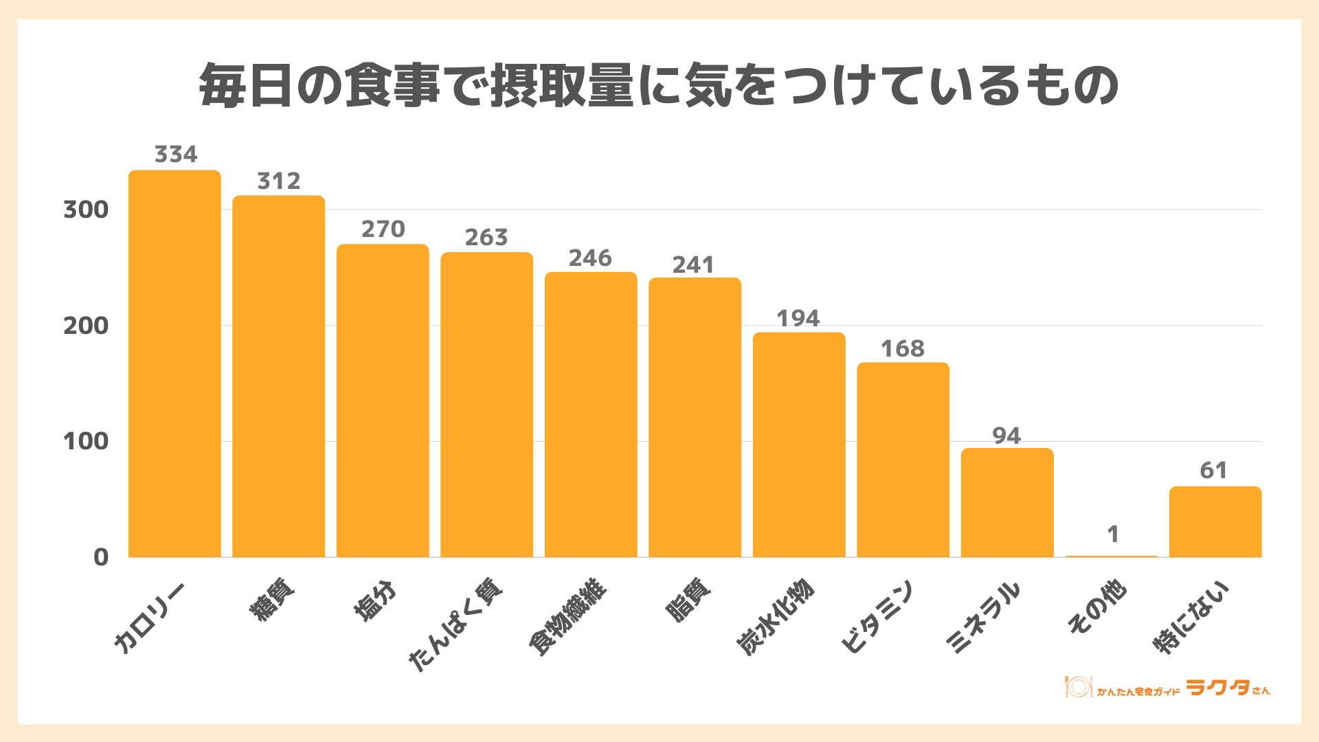 最も多いのは「カロリー」354人。その後、「糖質」312人、「塩分」270人、「たんぱく質」263人、「食物繊維」246人と続きます。