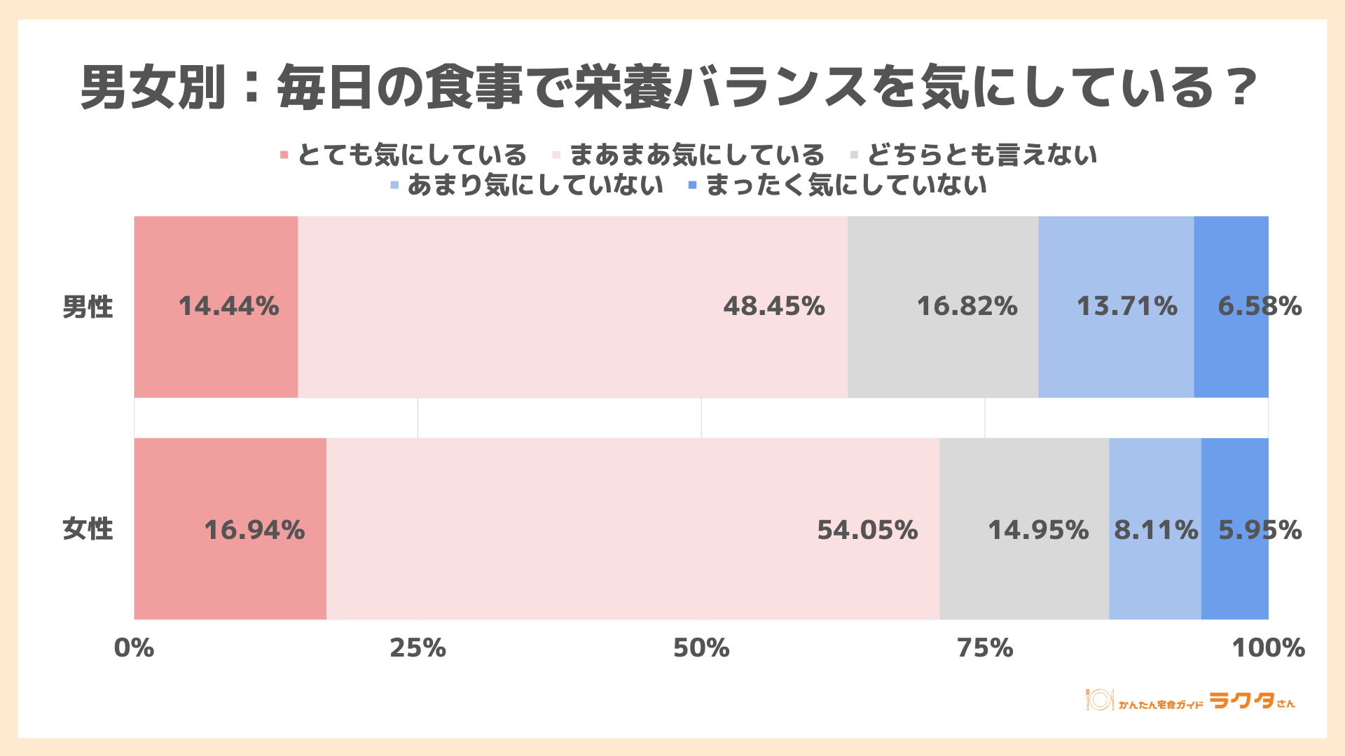 男女別で見てみると、「とても気にしている」が男性14.44%、女性16.94%。「まあまあ気にしている」が男性48.45%、女性54.05%でした。女性の方が栄養バランスへの関心が高いようです。