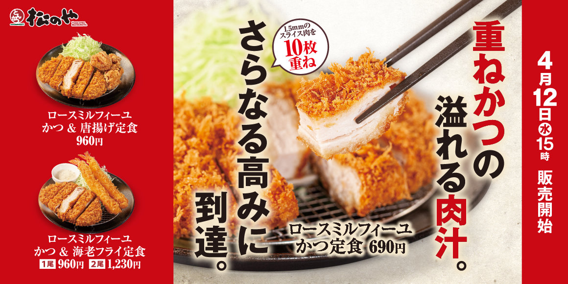 「ロースミルフィーユかつ」は、1.5mmにスライスした豚ロースを10層に重ねてサックリと揚げた一品。豚ロースならではのお肉の旨味や甘味が感じられるとともに、ジューシーでやわらかな食感がお楽しみ頂けます。八丁味噌風の味噌ダレがかかった「味噌ロースミルフィーユかつ定食」、大根おろしとポン酢であっさりお召し上がりいただける「おろしポン酢ロースミルフィーユかつ定食」の他、自慢のパリっとジューシーな本格唐揚げや、プリッと食感の海老フライとの盛り合わせ定食も発売。前回販売時は7層だったミルフィーユロースかつ、今回は10層にパワーアップしてさらなる高みに到達!松のやもより価値ある商品を提供できるよう高みを目指してまいりますので、本年度も変わらぬご愛顧のほどお願い申し上げます。