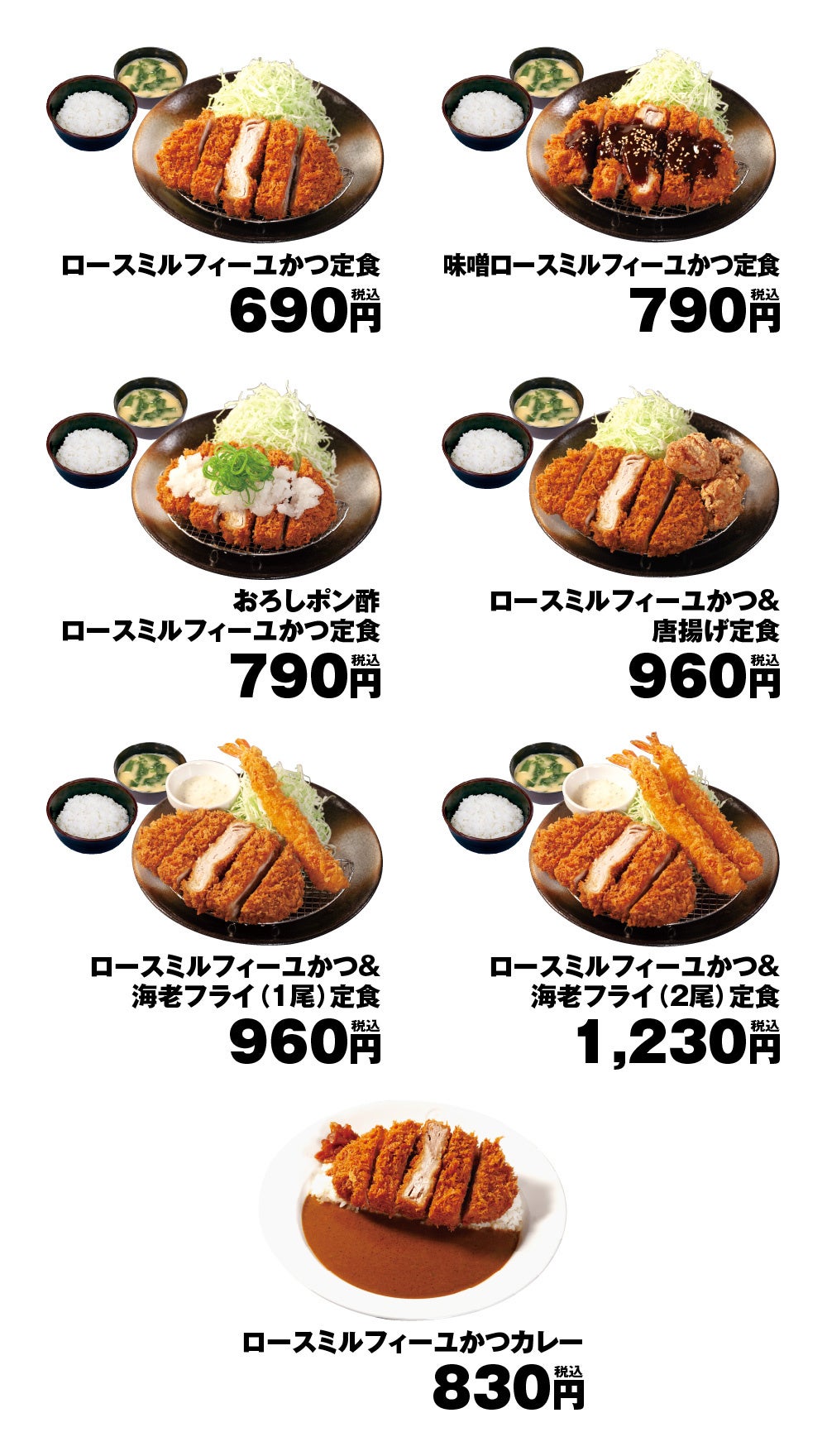 | 商品名 ロースミルフィーユかつ定食 690円 おろしポン酢ロースミルフィーユかつ定食 790円 味噌ロースミルフィーユかつ定食 790円 ロースミルフィーユかつ&唐揚げ定食 960円 ロースミルフィーユかつ&海老フライ(1尾)定食 960円 ロースミルフィーユかつ&海老フライ(2尾)定食 1,230円 ロースミルフィーユかつカレー 830円 単品ロースミルフィーユかつ 490円 ※全て税込価格です。また、店内・お持ち帰りの税込価格は同一です。 ※お持ち帰りいただけます。お持ち帰りのみそ汁は、別途60円でお買い求めいただけます。 ※「ロースミルフィーユかつカレー」は松屋松のや併設店では販売いたしません。ご了承ください。 ※松のやマイカリー併設店の「ロースミルフィーユかつカレー」はマイカリーソースでの提供となります。 発売日 2023年4月12日(水)午後3時~ |