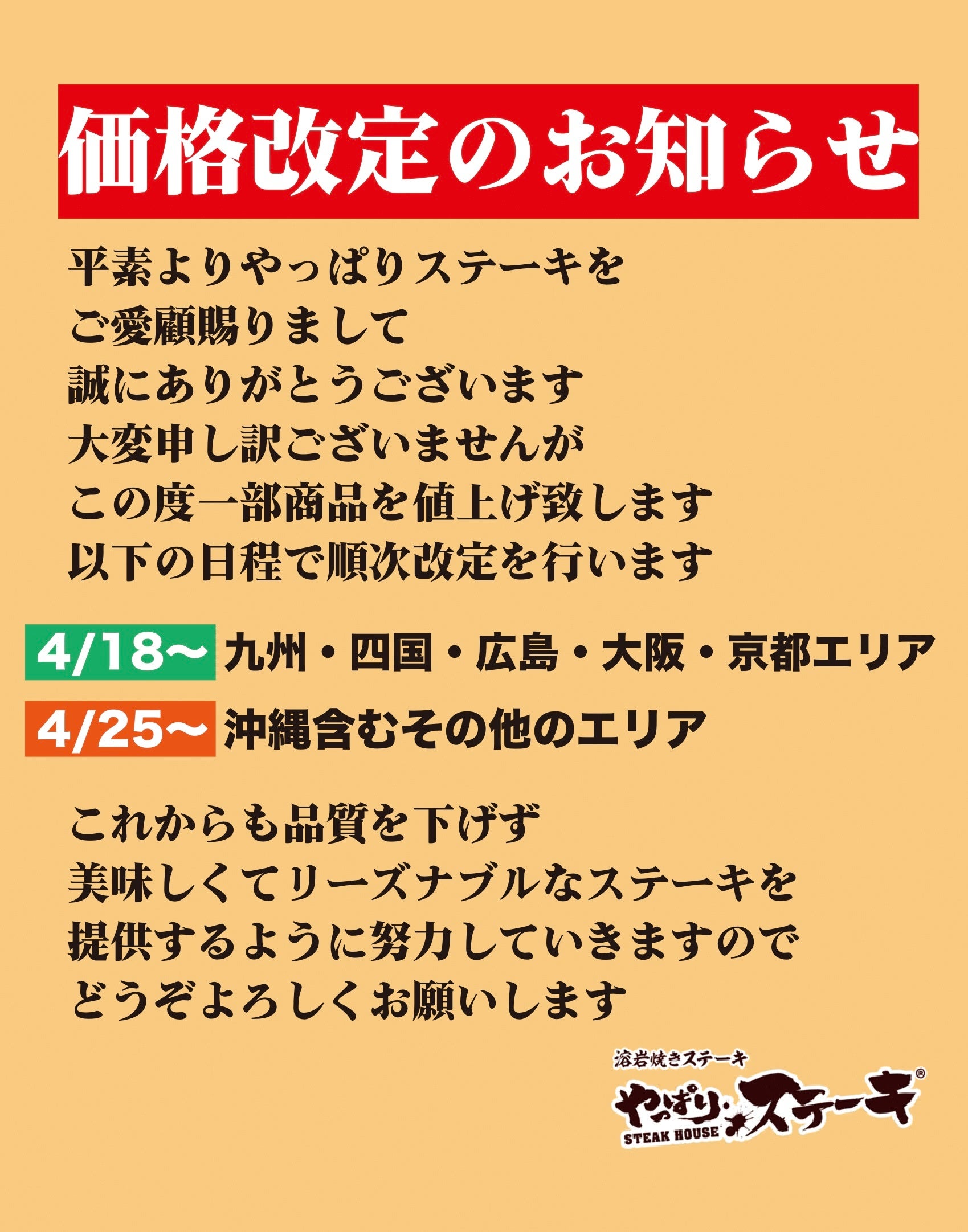 4月18日から順次、やっぱりステーキ一部商品を値上げ致します。