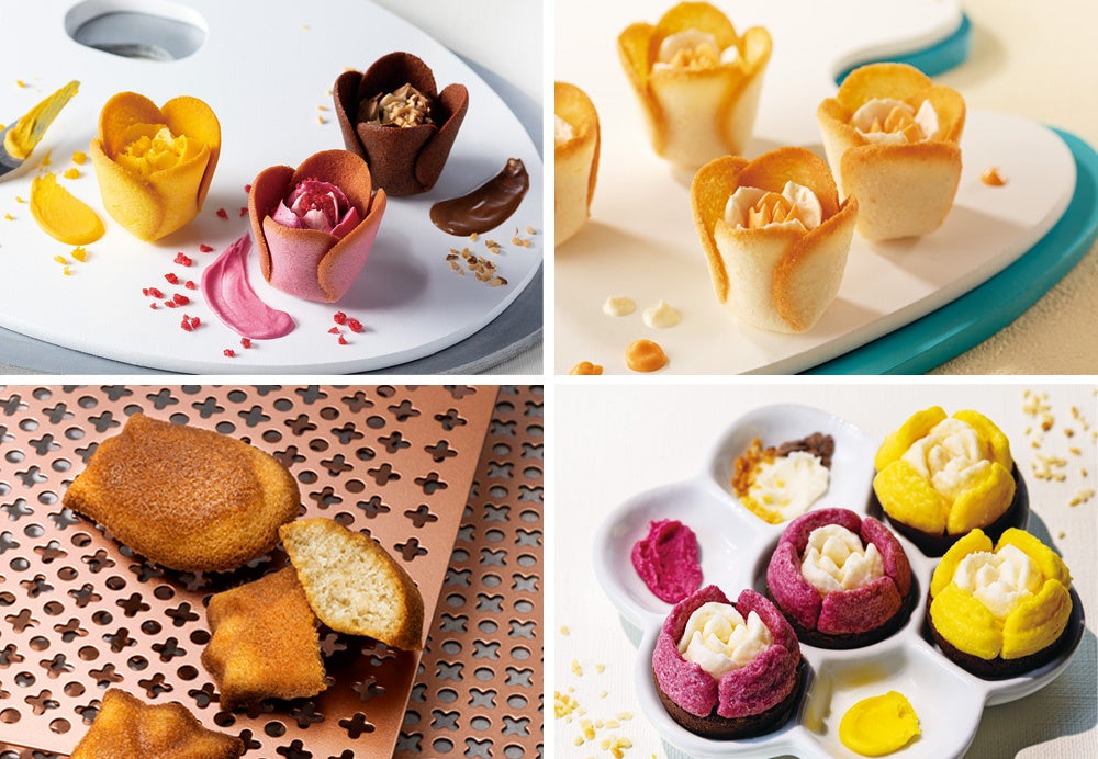 最も人気の「チューリップローズ」は、ラングドシャのチューリップの中にショコラクリームのローズを咲かせた代表作(上段)。ベリー、パッションマンゴー、キャラメルナッツと、期間限定・チーズの4味が楽しめます。コクのあるベイクドショコラにフルーツ&エピス香る「ローズガーデン」は、カシスバニラとカルダモンシトロンの上品な2味(右下)。さらに、4月10日(月)から新発売の「チューリップローズ フィナンシェ」は自家製の焦がしバターとスペイン産アーモンドの芳醇な味わいがたまらない一品です(左下)。TOKYOチューリップローズが贈る“可愛すぎるスイーツの花園”を思いっきり楽しんで!