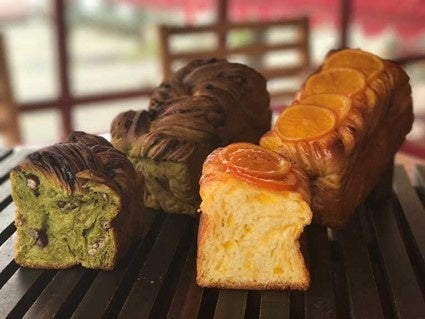 オレンジブレッド・大納言と抹茶ブレッド・クルミと黒糖ブレッドの3種からなるやさしい甘さのお店でも人気のスイーツブレッドです。