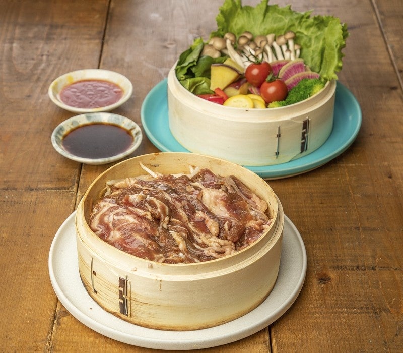 おすすめメニューは、【1日に必要な野菜量が摂れる”musi”ジンギスカン ラム&国産豚バラ&蒸し鶏】。ラム肉や国産豚バラ、エスニック蒸し鶏などのお肉と、生活習慣病予防の観点から、1日に必要な摂取量が350g以上といわれている野菜(注)をこの1品で補えるヘルシーな蒸し料理です。