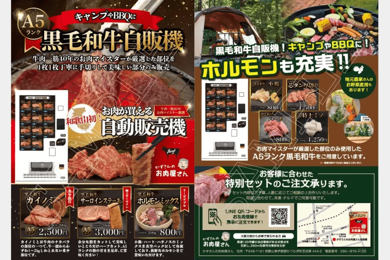 今回は食肉(A5ランクの黒毛和牛)やホルモン、牛すじカレーなどの加工食品を無人で販売したいというご要望があり、自動販売機型の無人店舗として冷凍自動販売機「SD-11DVM(ど冷えもん)」を2台導入させて頂きました。