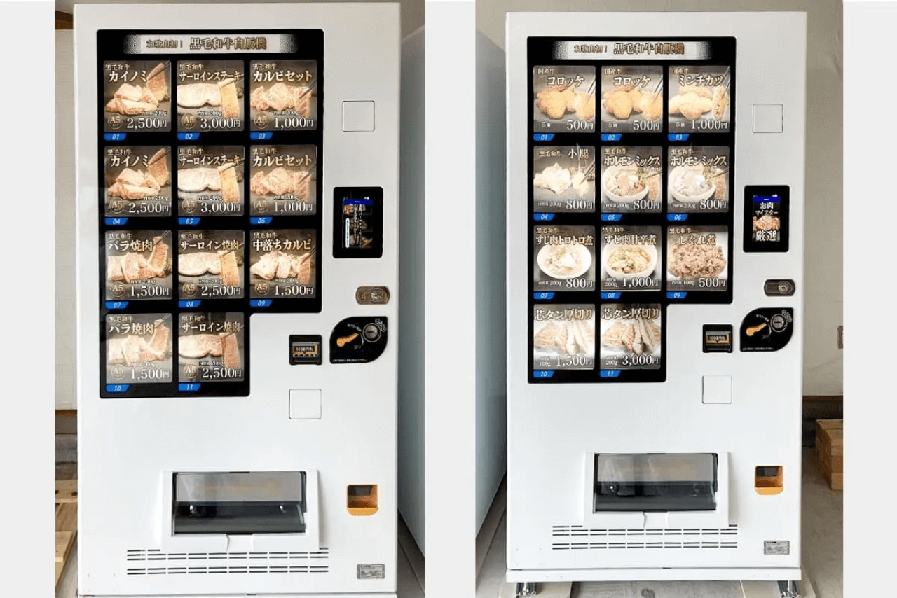 今回は食肉(A5ランクの黒毛和牛)やホルモン、牛すじカレーなどの加工食品を無人で販売したいというご要望があり、自動販売機型の無人店舗として冷凍自動販売機「SD-11DVM(ど冷えもん)」を2台導入させて頂きました。