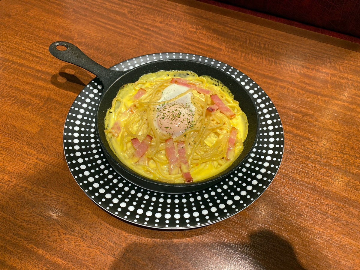 もっちりとした太めのパスタが濃厚なソースに絡み合う絶品カルボナーラ。