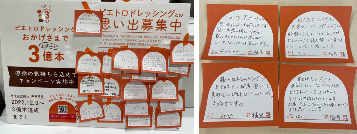 会場には、お客様とピエトロドレッシングとの思い出を募集し掲示するコーナーを設置。これまでのイベントを通して、現在、400件以上もの心あたたまるエピソードが寄せられています。