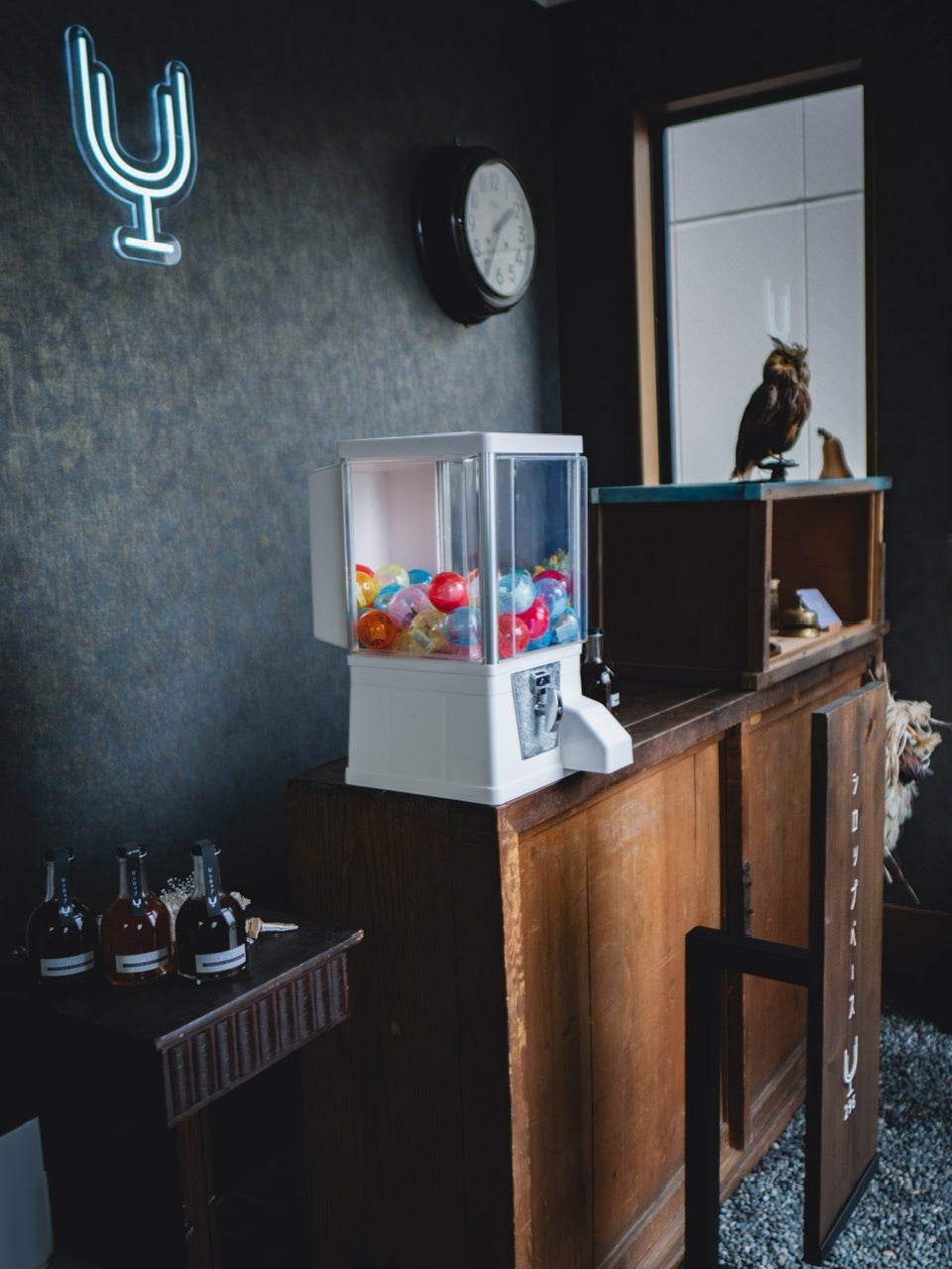 古道具を使用した内装やネオンのロゴが目印!