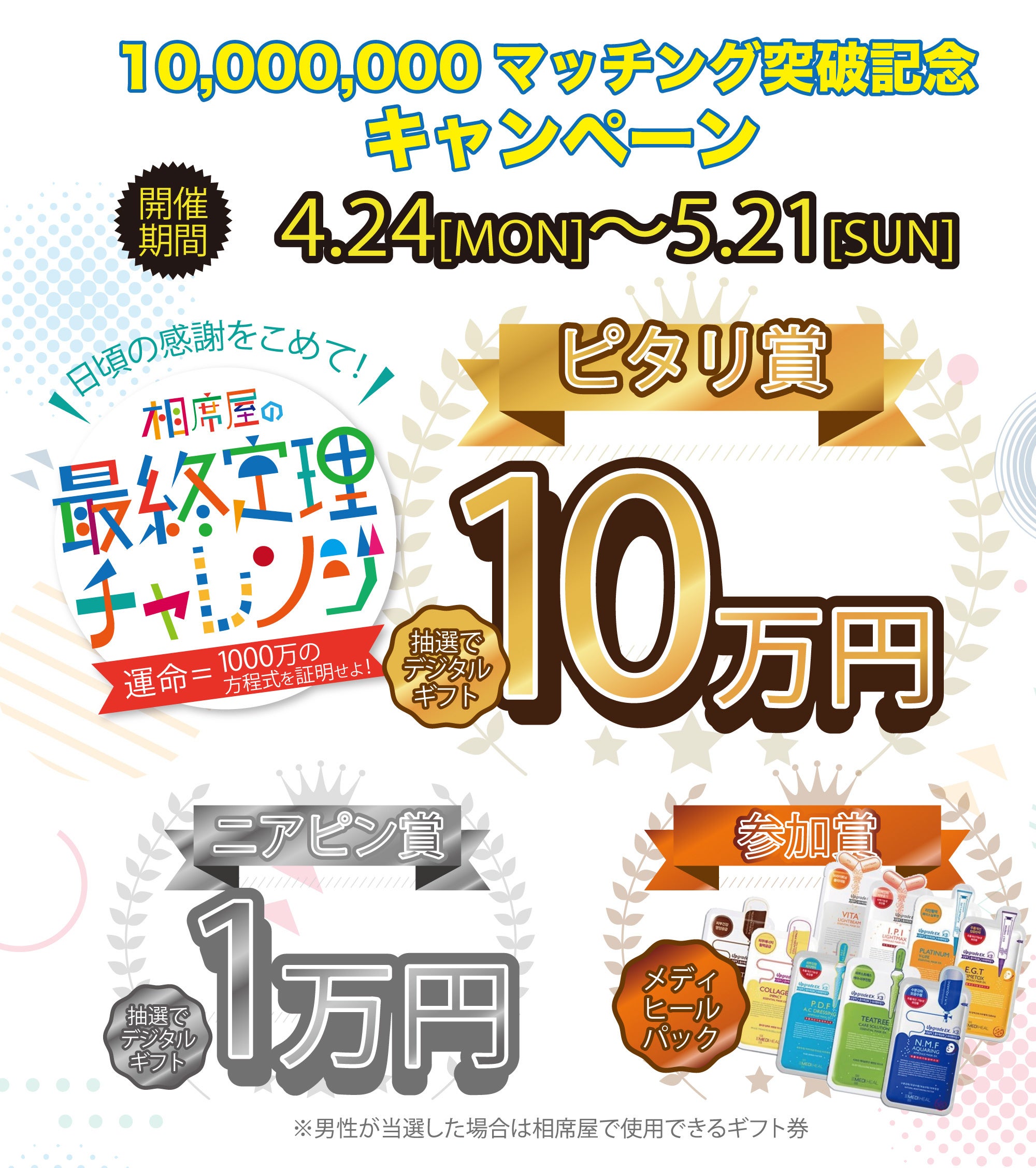 ※男性が当選した場合は相席屋で使用できるギフト券をプレゼントいたします。