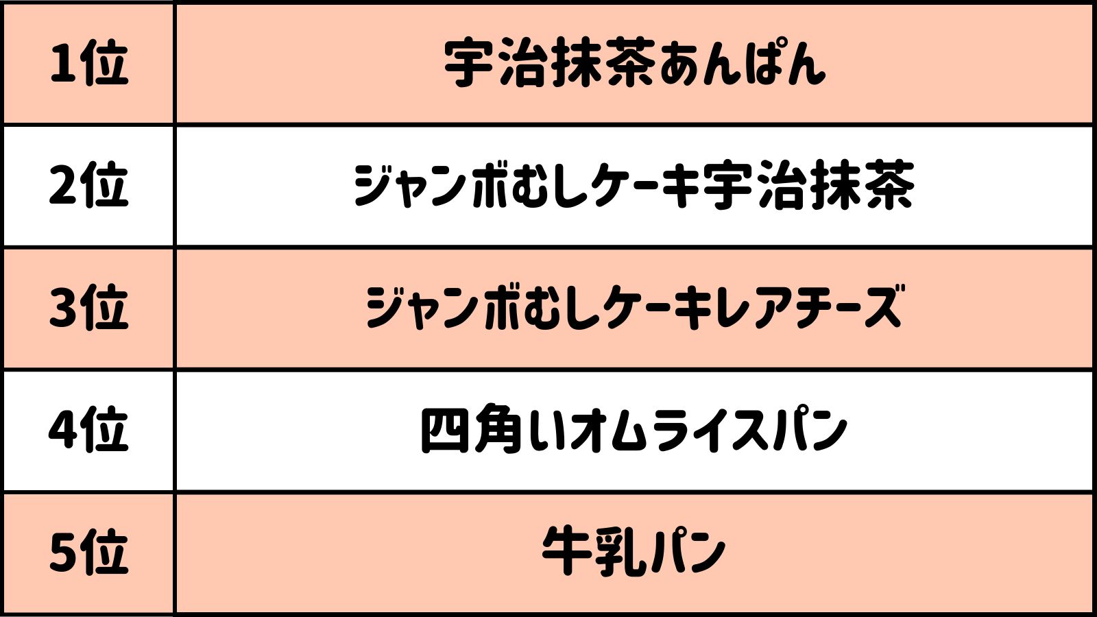 1~2位は、宇治抹茶餡使用の商品がランクイン。1位の「宇治抹茶あんぱん」は、風味豊かな宇治抹茶あんを使用。2位の「ジャンボむしケーキ 宇治抹茶」は今月リニューアルを行い、“抹茶”の奥行きのある風味を生かしつつ、まろやかで幅広い世代の方にお手に取って頂けるような味わいに仕立てました。3位の「ジャンボむしケーキ レアチーズ」は北海道クリームチーズ使用、濃厚ながらも爽やかな味わいです。
