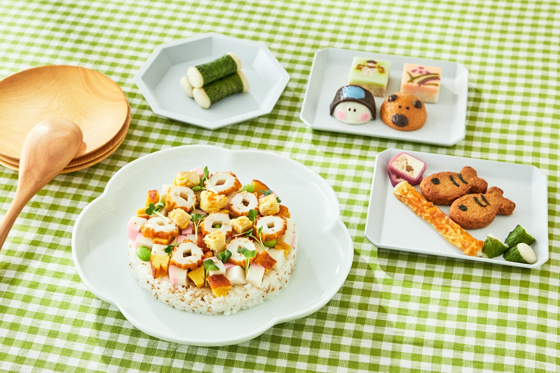 板 かまぼこ、伊達巻、ちくわなどを小さく切ってご飯に散らせばあっという間に「ちらし寿司」の完成です。土台は定番の酢飯ではなく、白ごまを混ぜたごはんにすることでかまぼこのうま味と香りを一層引き立てます。端午の節句には欠かせない鯉のぼりにはお魚の形をした「小魚さつま」を使用しました。