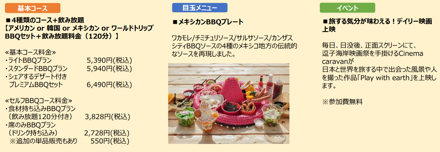 世界を旅する気分になれる、手ぶらバーベキュービアガーデンです。「空のアミューズメントパーク」をテーマに、昨年好評であったメリーゴーランドやポップなフォトブースを今年も設置しており、フォトジェニックな雰囲気を楽しめます。お食事はアメリカ、韓国、メキシコをイメージした見た目もポップなBBQコースと常時4種類以上の世界のビール、1000種類のカクテルとハンドメイドサワーが飲み放題で楽しめます。