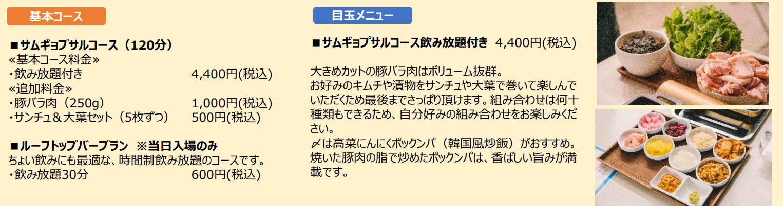 キムチ・サムジャンなどの漬物と野菜を合わせて楽しむスタイルのサムギョプサルと、10種類のシロップで作るソジュサワー、5種類のマッコリ、お茶割りなど、自由な組み合わせをロゴ入りオリジナルグラスでお楽しみください。
