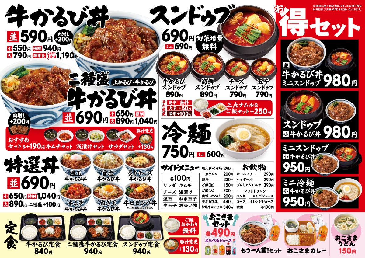 「牛かるび丼」と「スンドゥブ」はいずれもトッピングメニューを複数ご用意するほか、お得なセットメニューやご飯のおかわりが無料となる定食でもお楽しみいただけます。そのほか、「冷麺」や「お子様メニュー」、「サイドメニュー」などもございます。