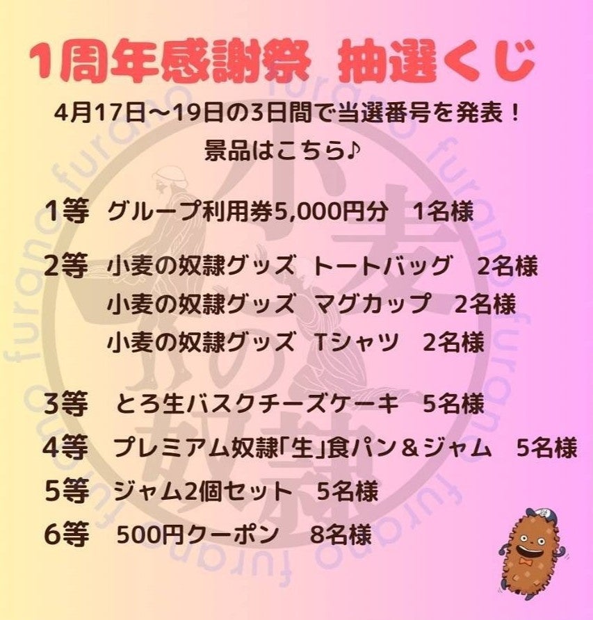 キャンペーン内容:現在、1,000円お買い上げごとに抽選券1枚を配布中。抽選で30名様に、小麦の奴隷商品をプレゼント!