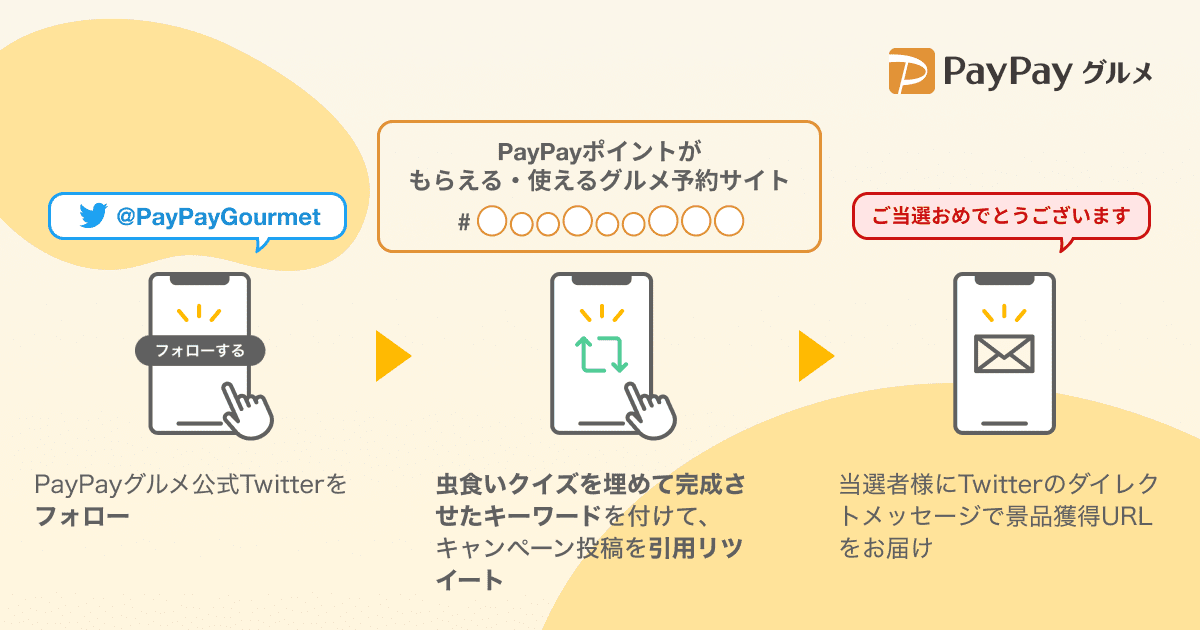 「PayPayグルメ」公式Twitterアカウントをフォローし、同アカウントが投稿する虫食いクイズを埋めたキーワードを引用リツイートで投稿することで、正解者の中から10名にPayPayポイント50,000円相当を付与します。