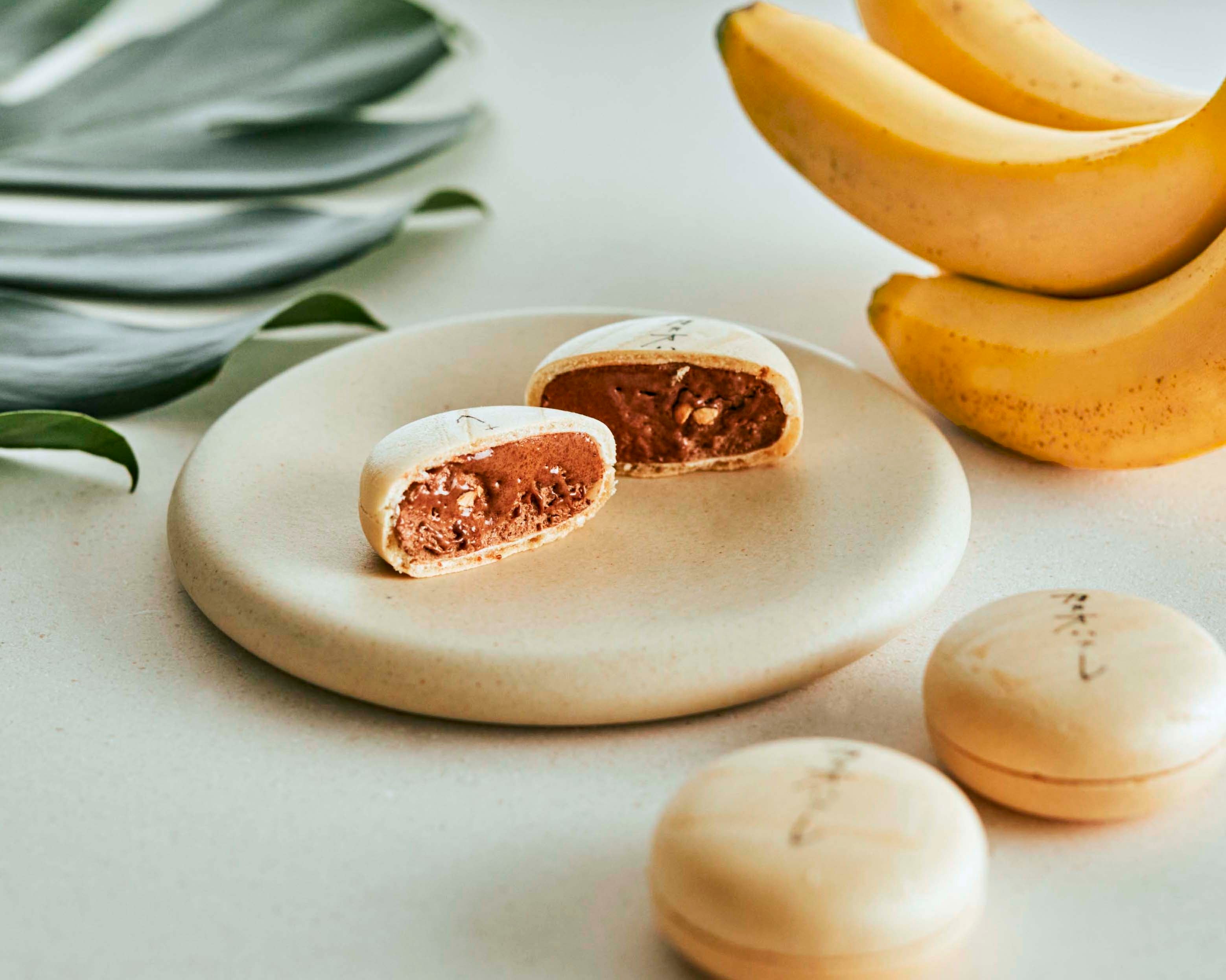 サクサクのモナカの中に口溶けなめらかで軽やかなコロンビア産カカオのチョコレートクリームを贅沢に挟みました。ミルクチョコとビターチョコをブレンドし、バナナとアーモンドを練り込んだ味わい深い一品です。アクセントにキャラメリゼしたアーモンドを加えました。