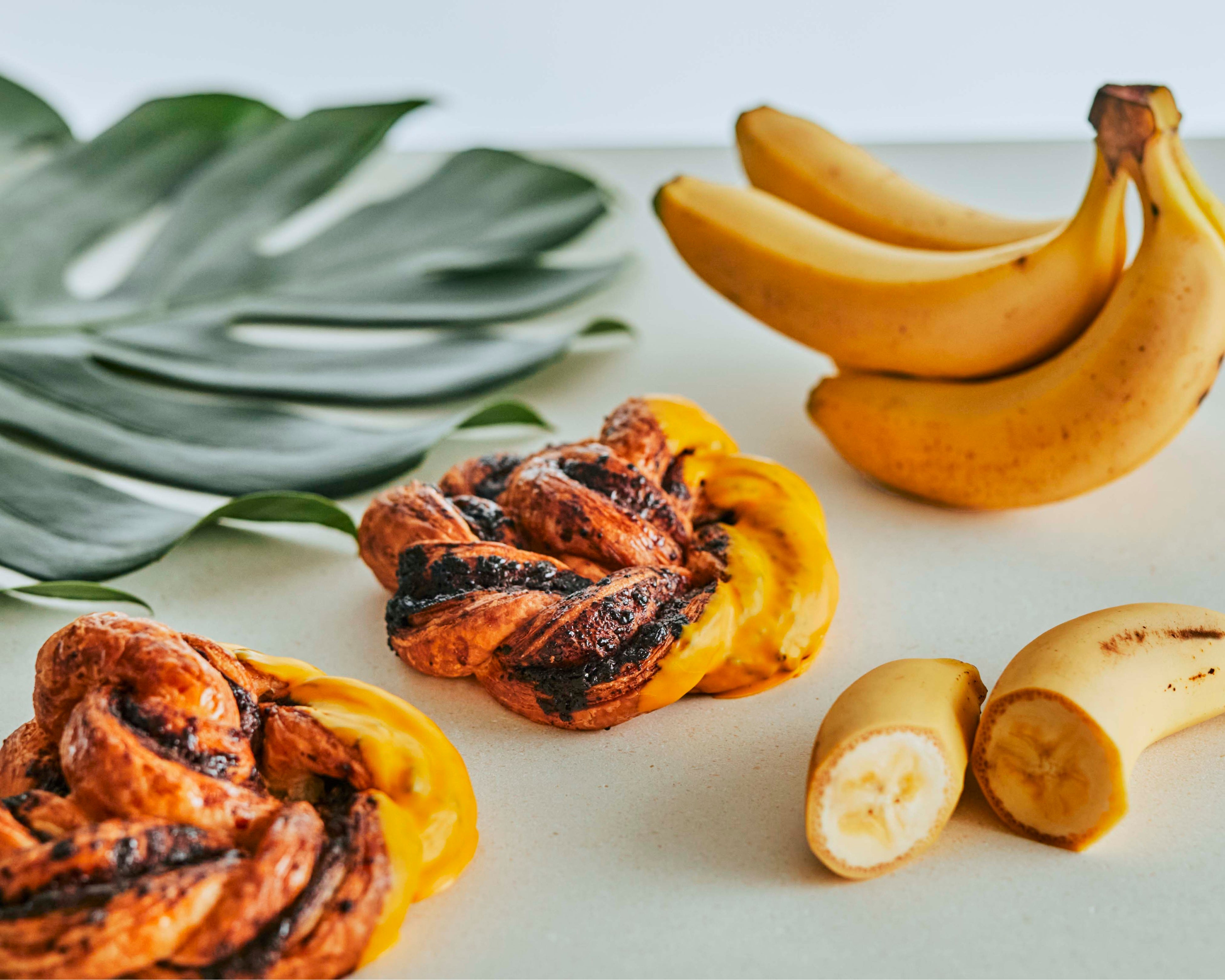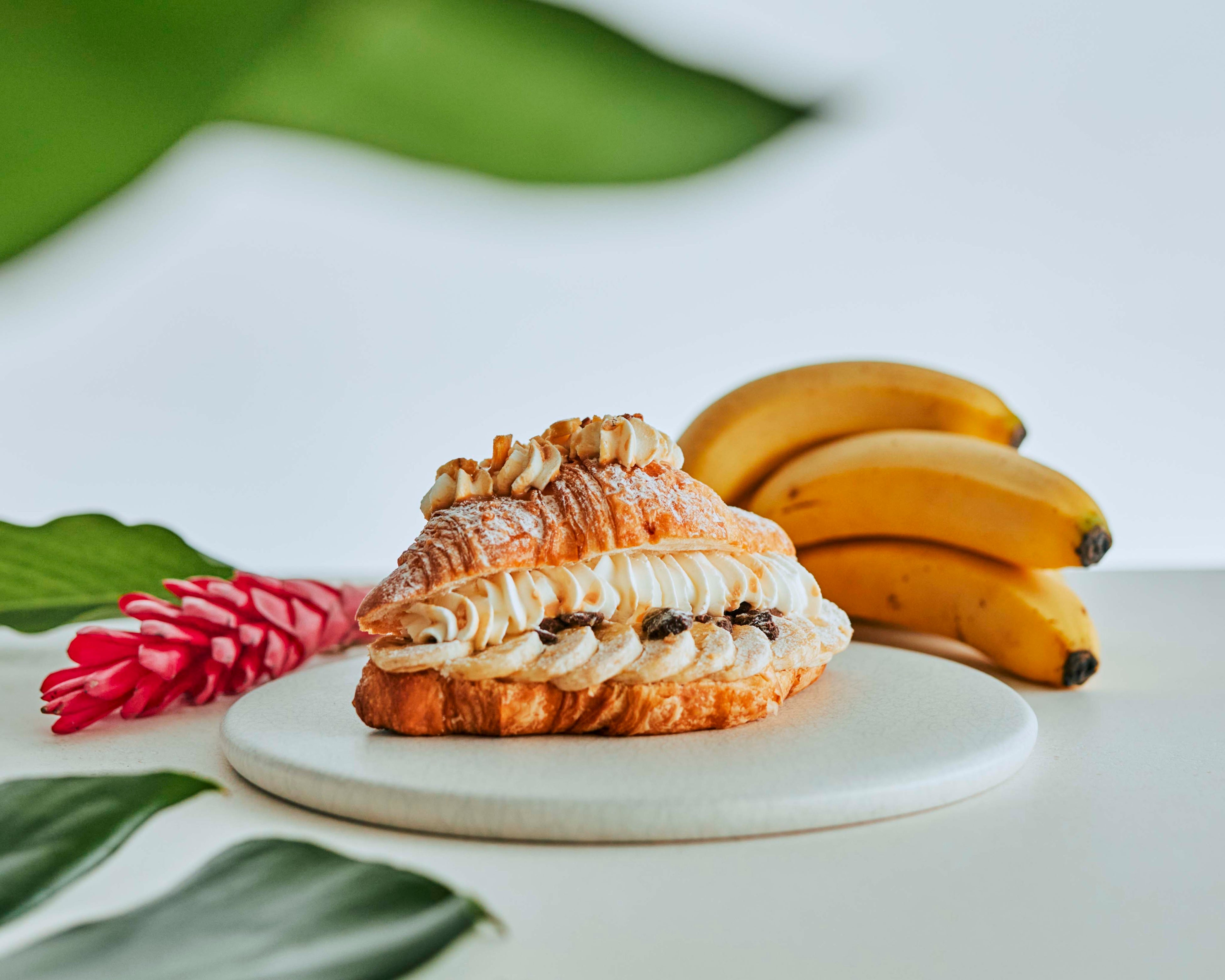 国産の発酵バターで焼き上げたサクサクのクロワッサンの中に、フレッシュバナナのカスタードクリームとスライスバナナ、たっぷりのパリパリ食感のチョコレートをサンドしました。