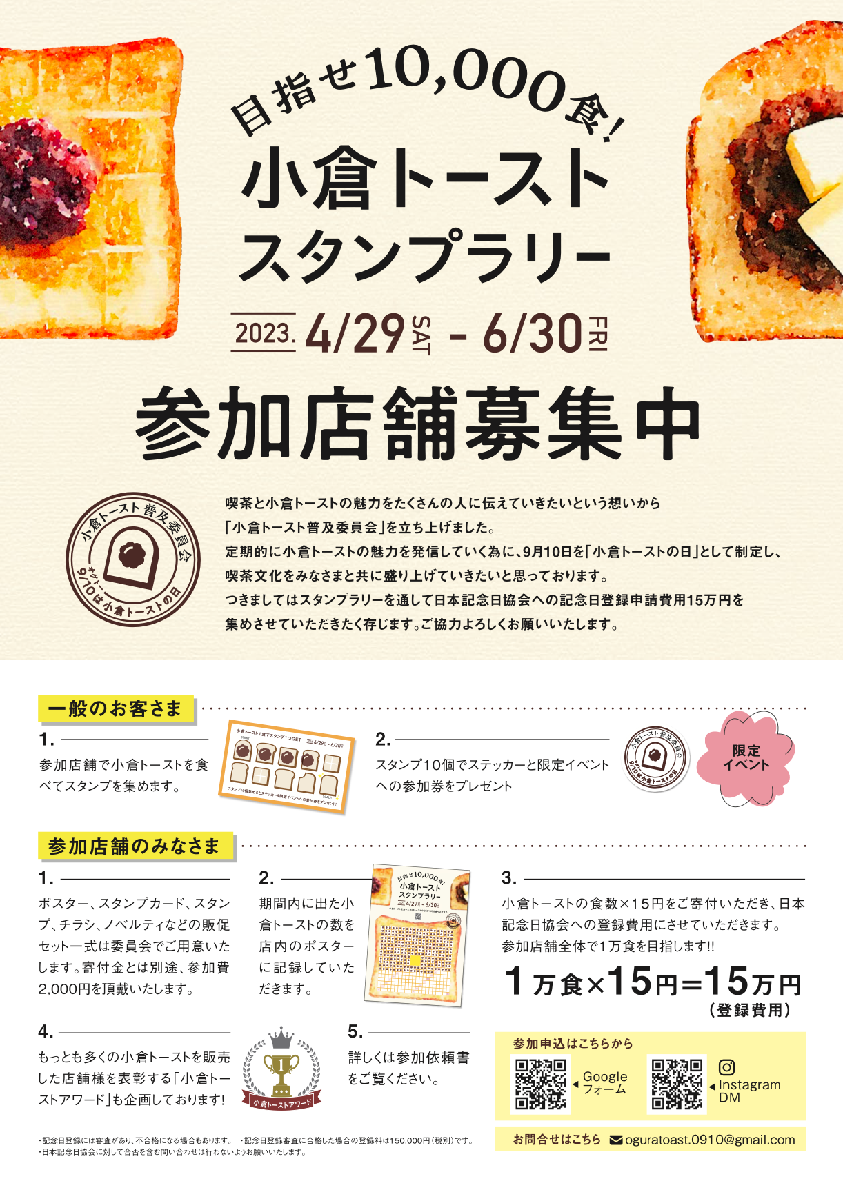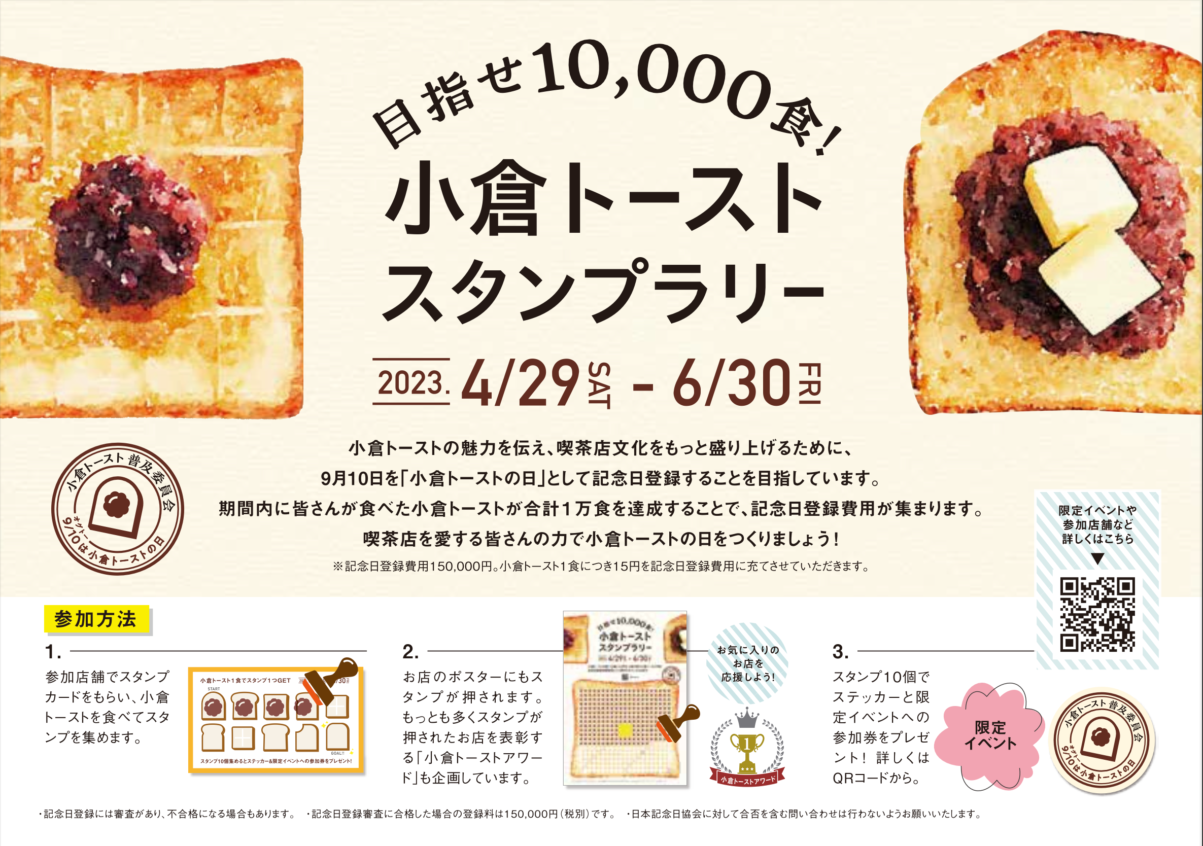 9月10日(0910 / オグトー)を「小倉トーストの日(仮)」と記念し、年に一回、小倉トーストという喫茶文化の啓蒙を行います。