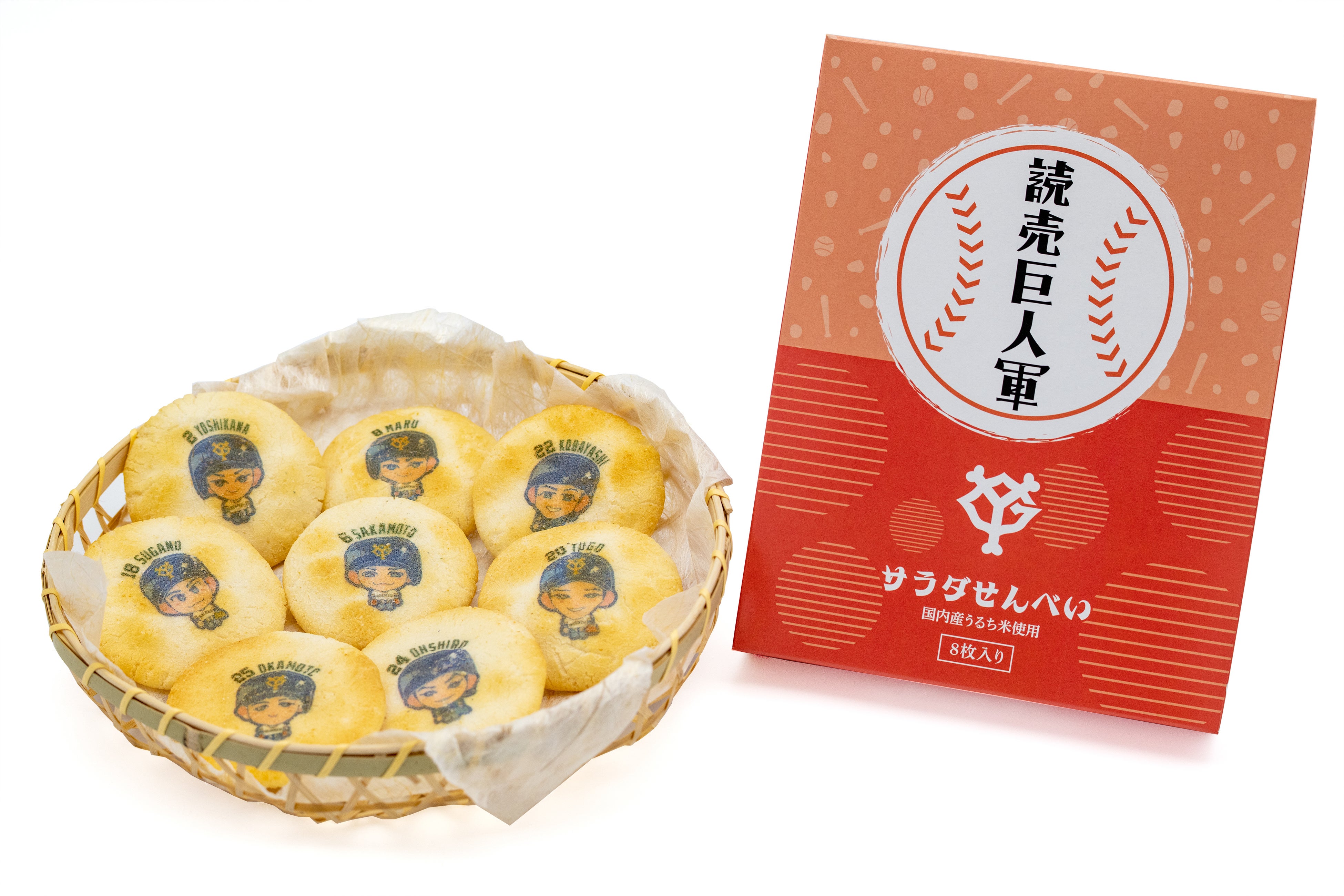 国産のうるち米を使い、美味しく焼き上げたサラダせんべいに、ジャイアンツの選手を可愛くデフォルメしたイラストをプリントしています。サラダせんべいならではの程よい塩気と、パリッと心地よい食感を楽しみながら、ジャイアンツを応援しよう!