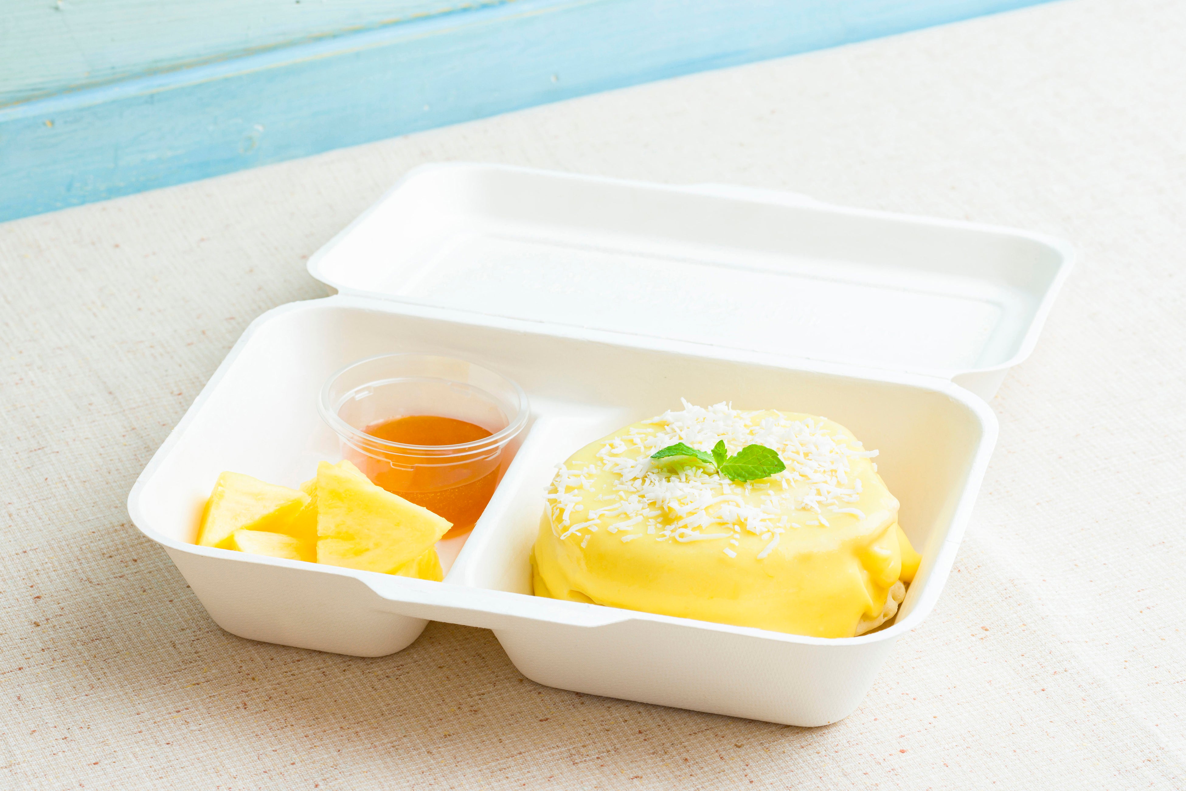 ハワイならではのココナッツと一緒に焼いた生地に爽やかなパイナップルクリームとココナッツアイスをのせました。マンゴーソースで味を変えてお召し上がりください。